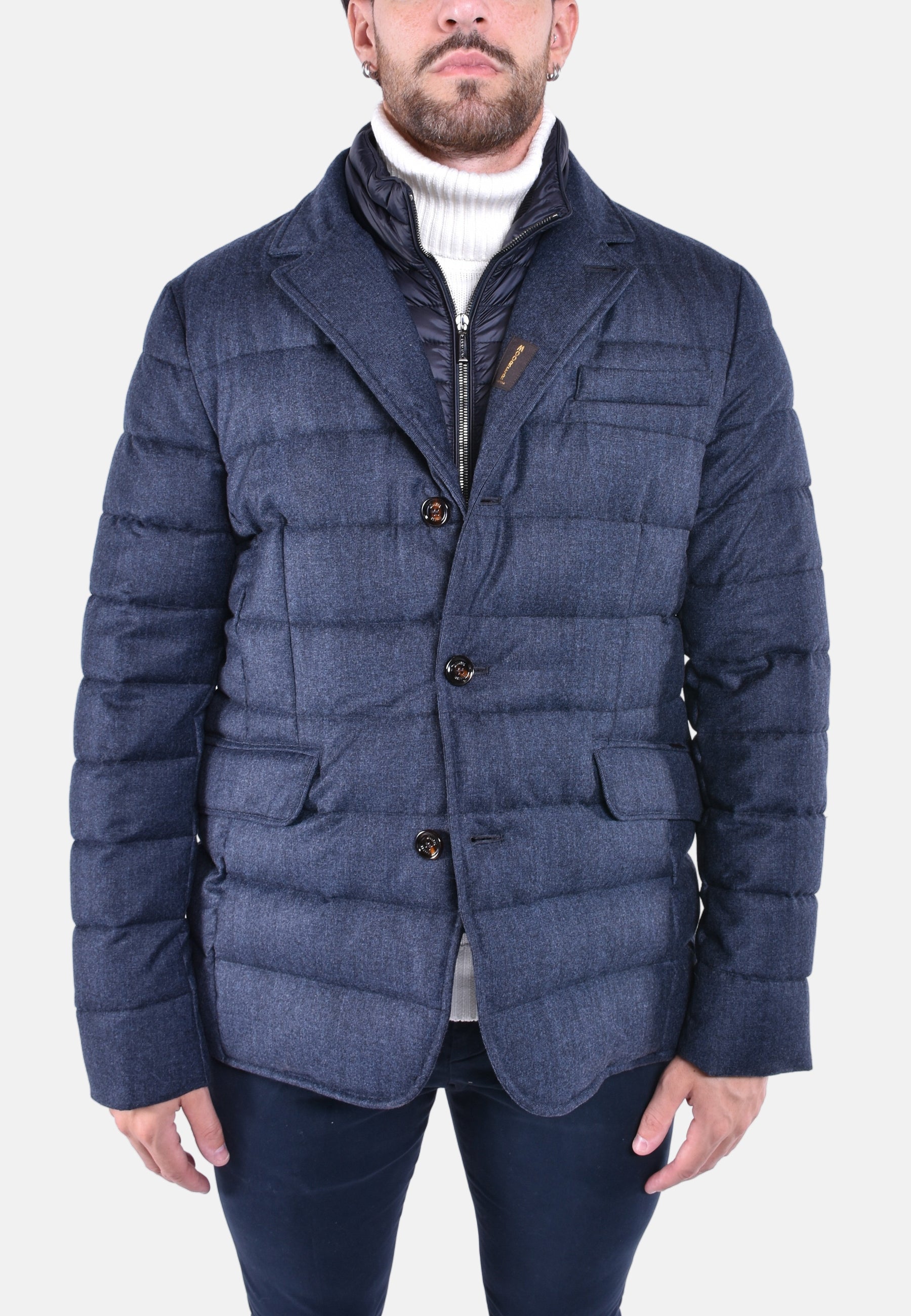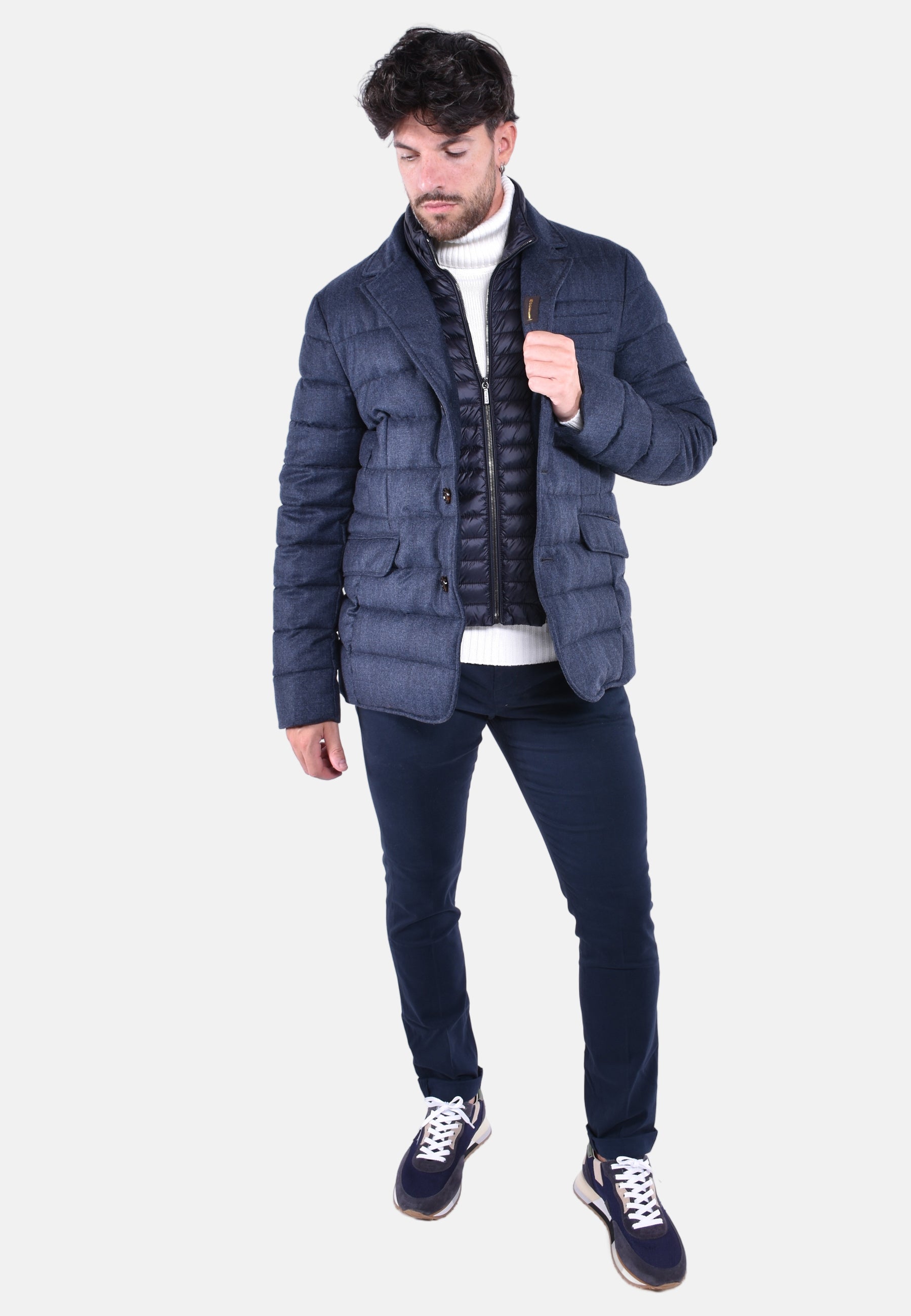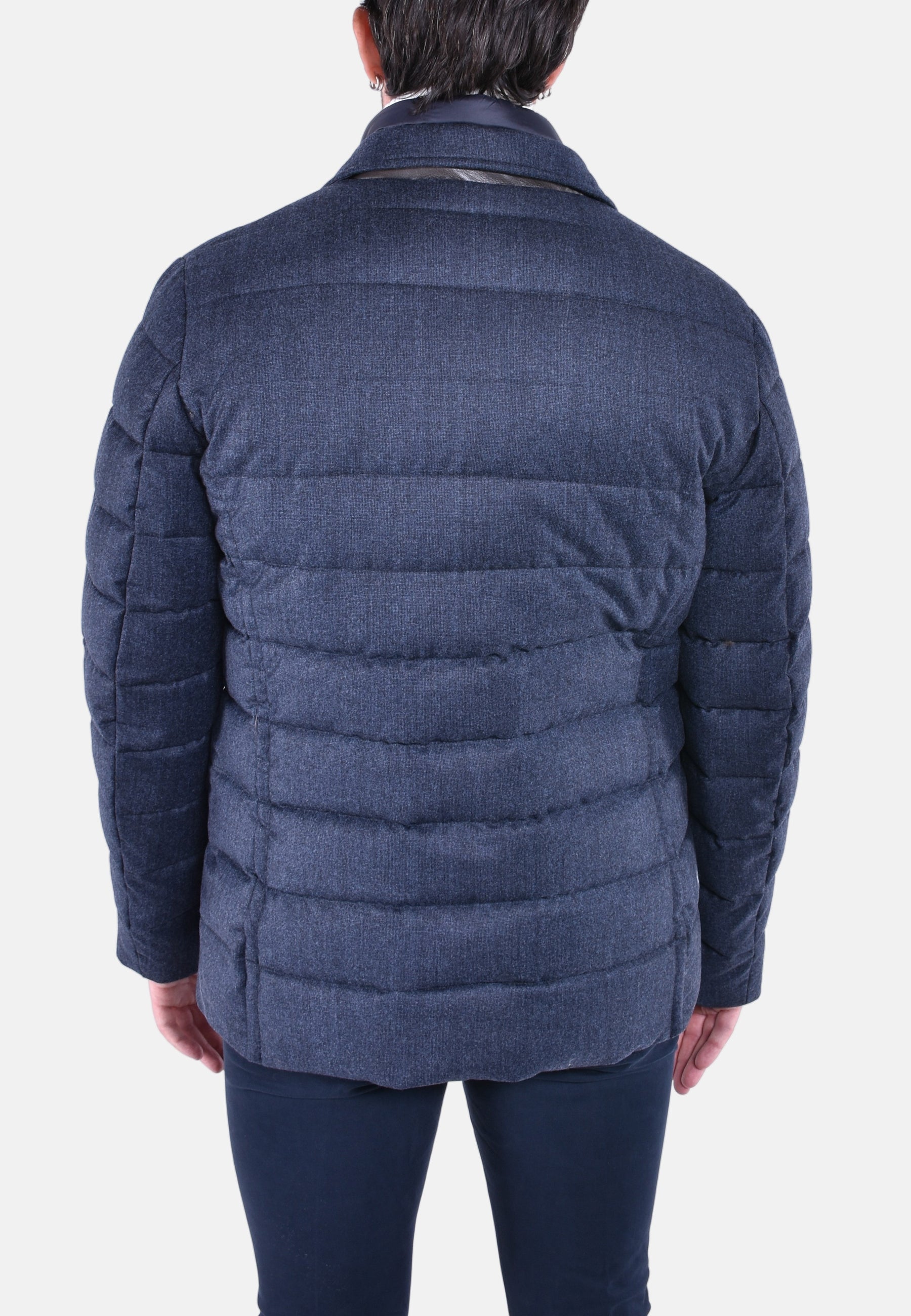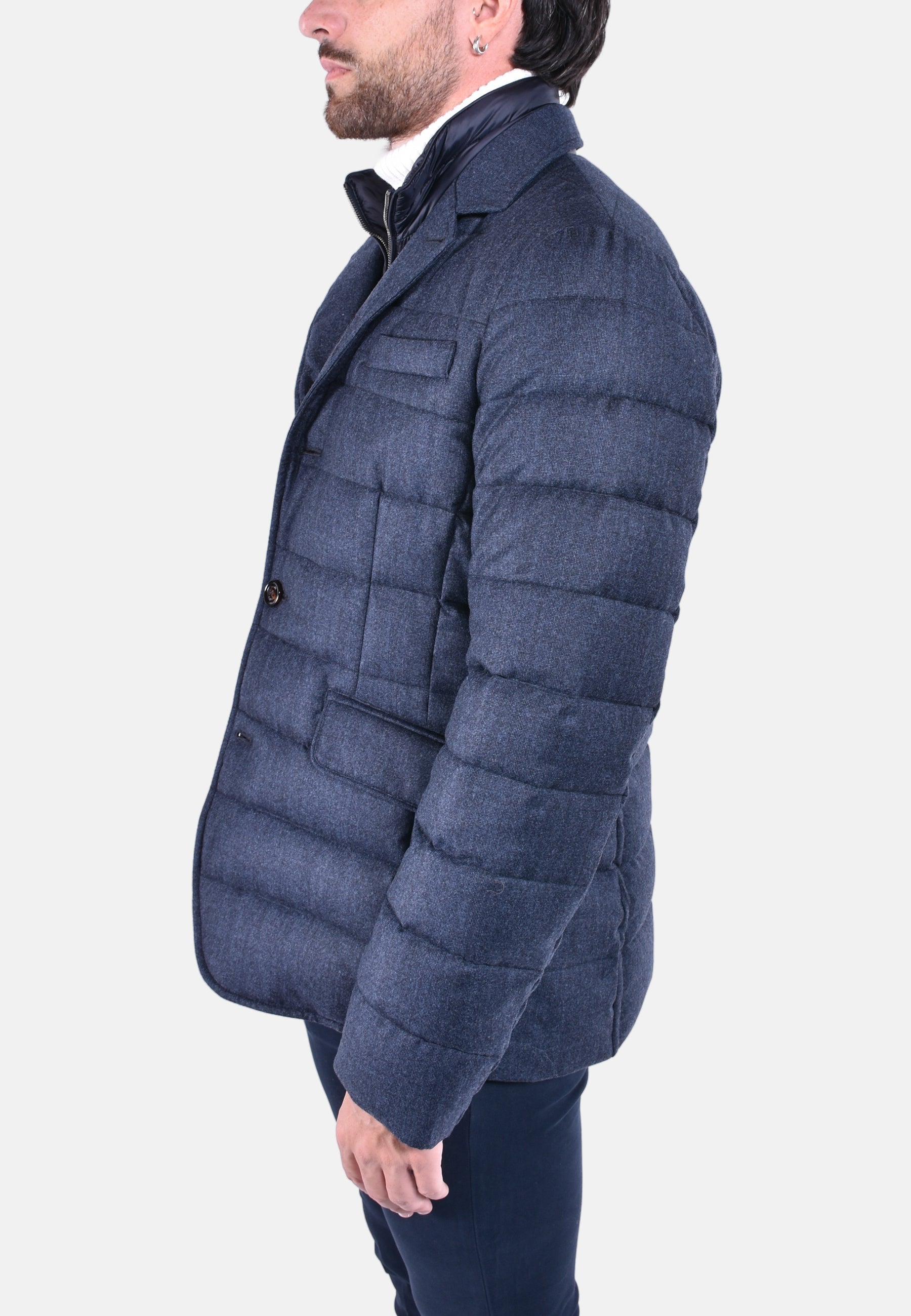 Giacca dalla linea dritta imbottita in piuma e trapuntata a boudin. Realizzata in morbida flanella di lana in micro fantasia.Stacchino interno removibile. Chiusura con zip in metallo spazzolata.