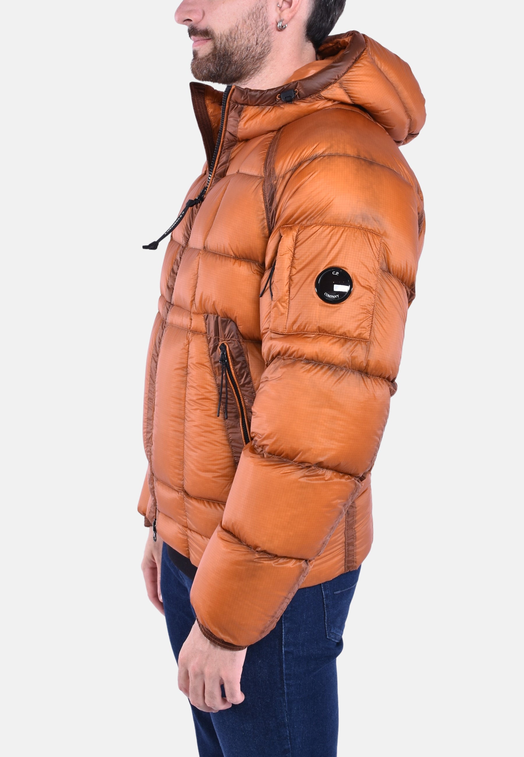Piumino con cappuccio realizzato in D.D. Shell, un nylon micro-ripstop opaco 7 denari. La leggerezza e la trasparenza del materiale enfatizza la costruzione dei capi. Processo di iniezione Direct Down.