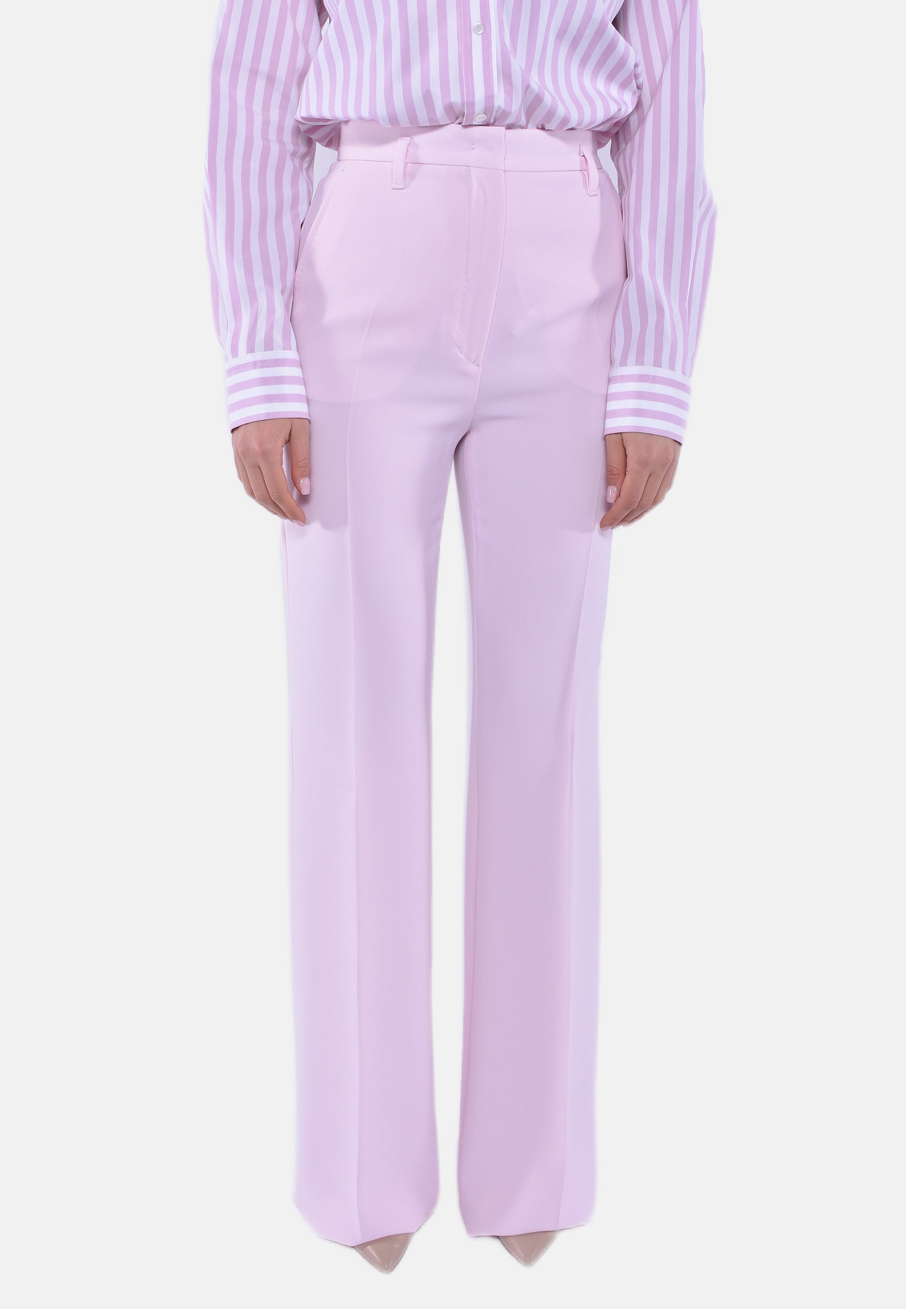 Pantalone in cady caratterizzato da una silhouette a zampa d'ispirazione anni 70. Il modello presenta piega stirata sulla gamba, tasche alla francese sui fianchi e tasche a filetto con bottone sul retro. Chiusura con listino alto in vita, zip con patta e gancetto.