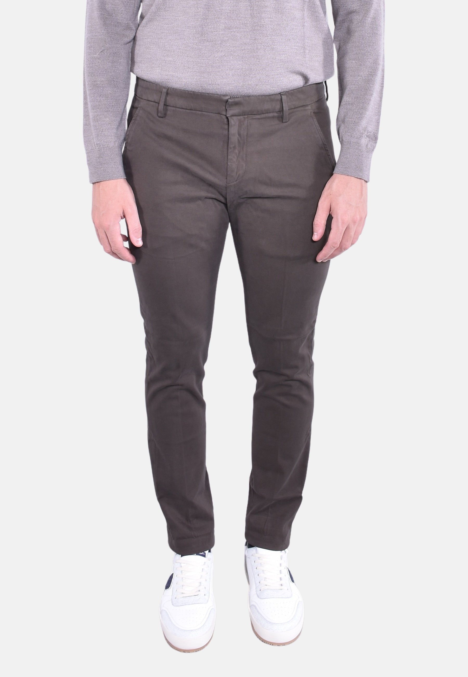 Pantaloni Gaubert slim chino firmati Dondup realizzati in raso di cotone stretch blu scuro con vita bassa, passanti, logo Dondup, chiusura frontale coperta, tasche laterali e tasche posteriori a doppio filo con bottone. Tintura in capo.