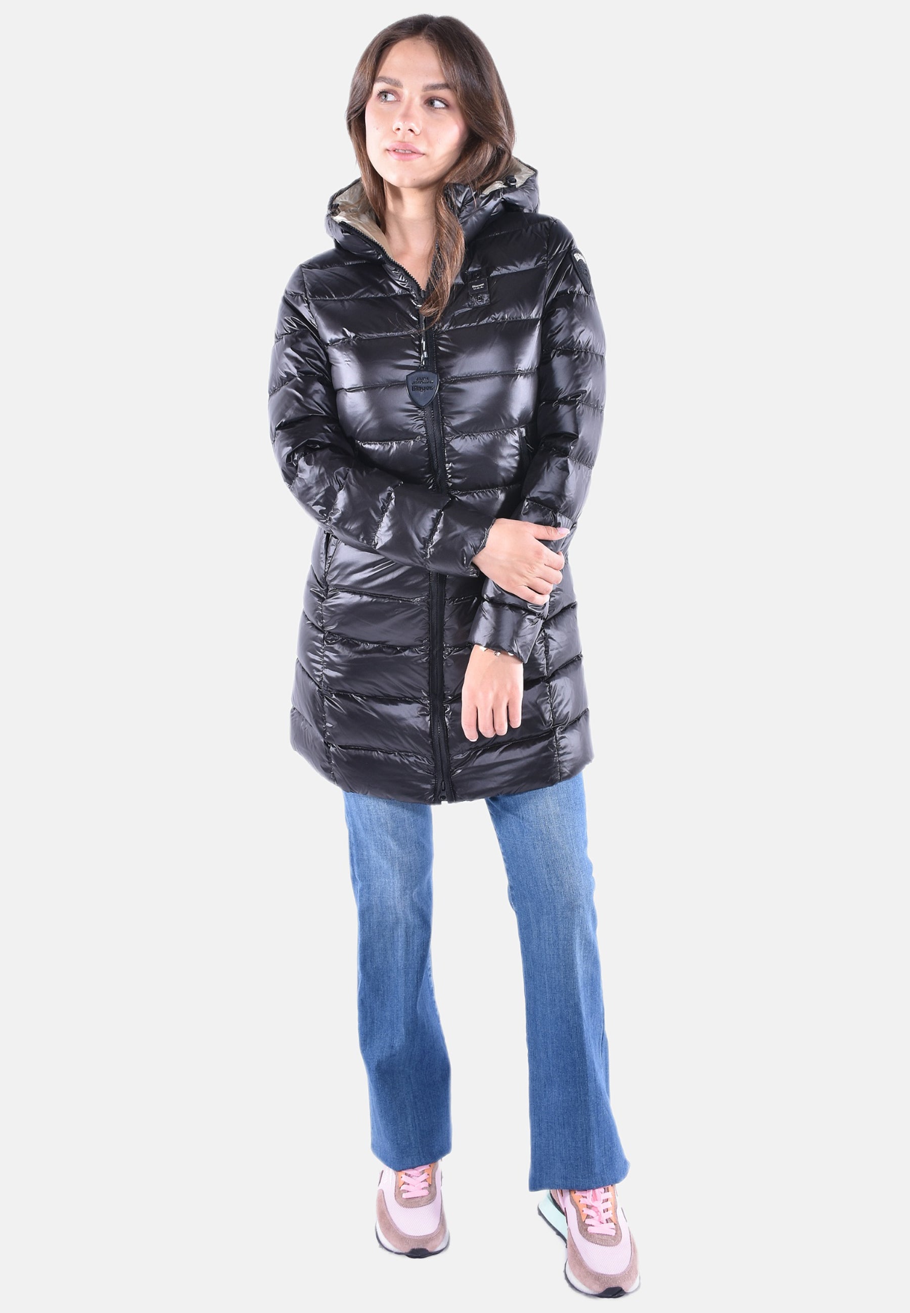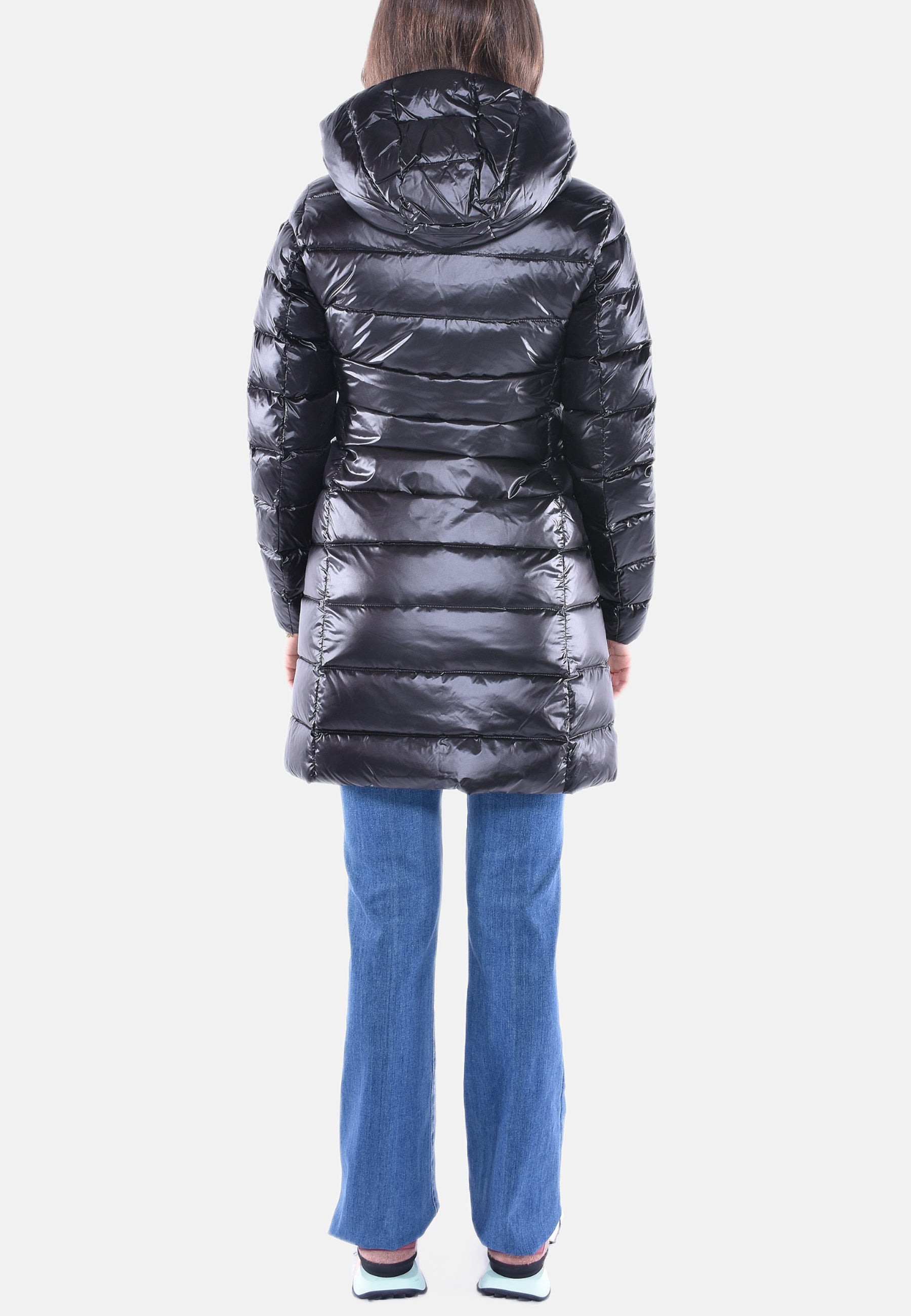 Piumino lungo donna leggermente svasato in nylon cangiante imbottito piuma leggera e cappuccio fisso con coulisse.
