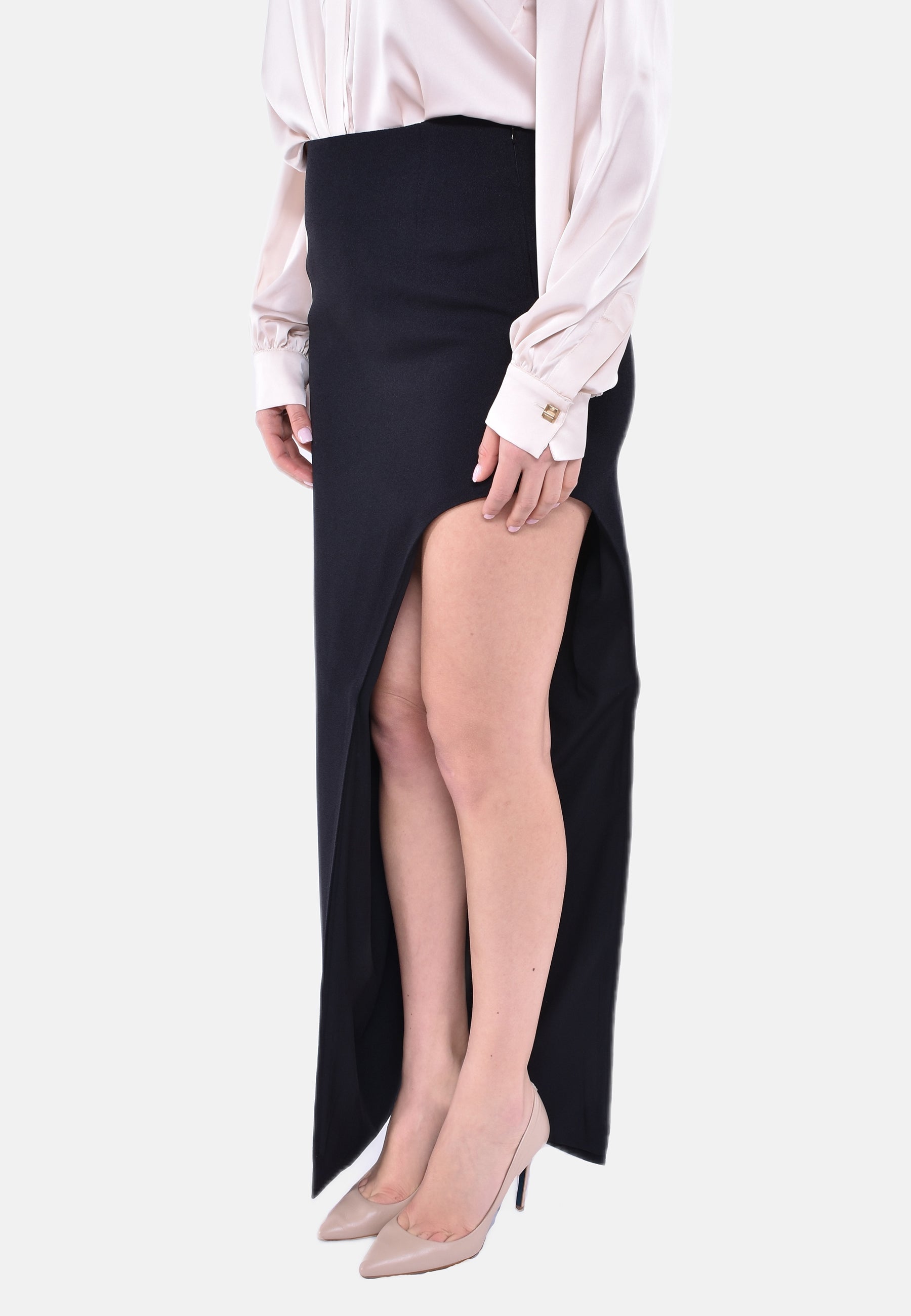 Gonna lunga a vita alta in Cêpe. Modello dritto con spacco profondo sul lato sinistro. Chiusura con zip nascosta.