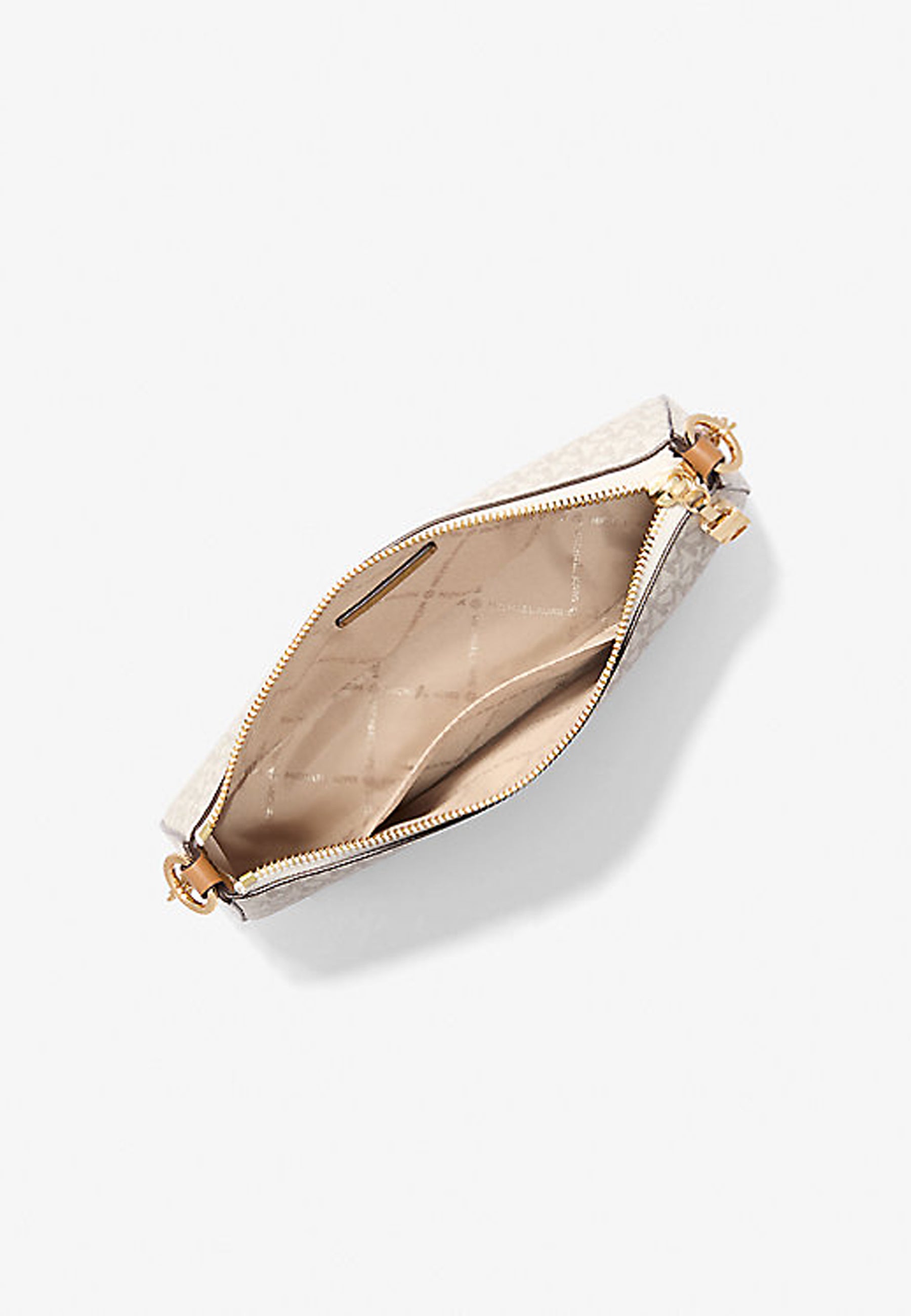Caratterizzata dell'esclusiva stampa logo, questa piccola pochette è l'ideale per viaggiare leggeri. Con sufficiente spazio per telefono, portacarte e occhiali da sole, la silhouette compatta presenta una tracolla a catena in tonalità oro per un look glamour.