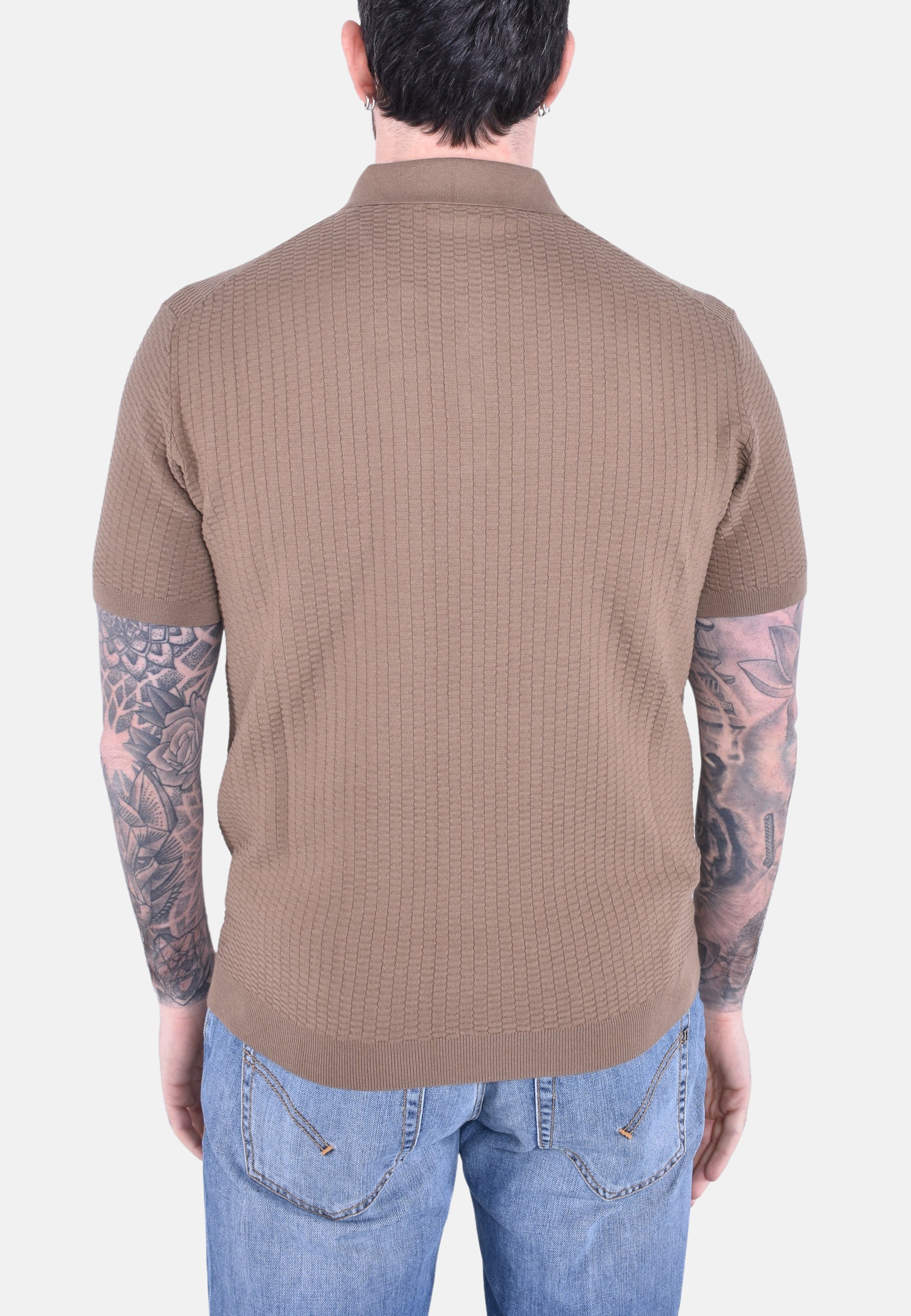 Questa polo a maniche corte in cotone e lino si distingue per la sua lavorazione in punto Arabesco, che dona al tessuto una texture raffinata e dinamica, esaltandone la morbidezza e la leggerezza.