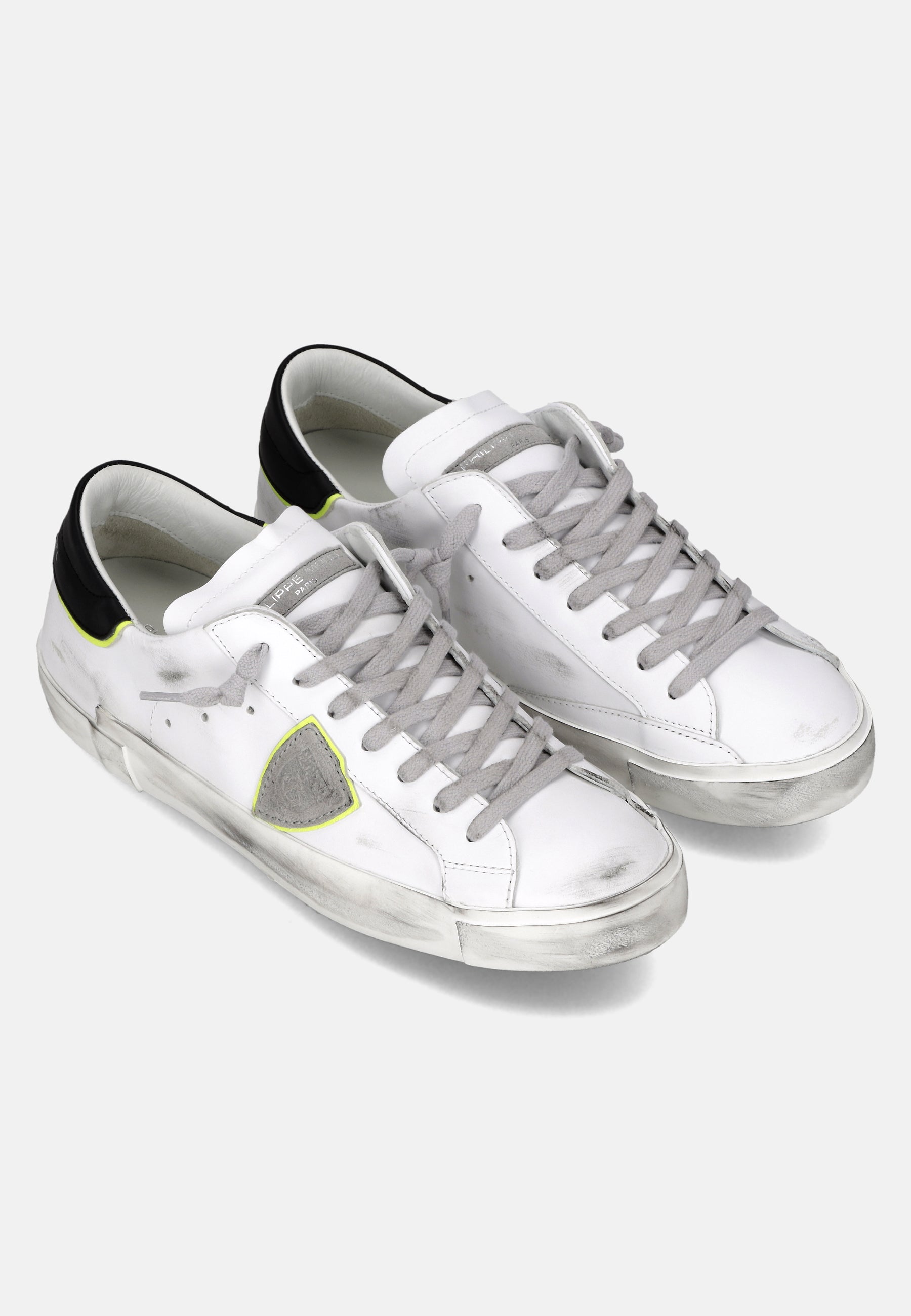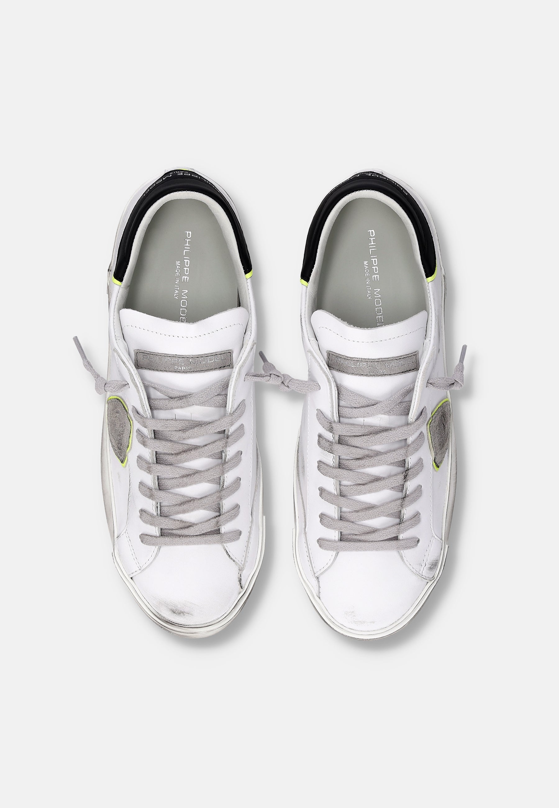 Materiali: Sneaker bassa in pelle effetto used con spoiler a contrasto in pelle lavata con logo. Foderata internamente in spugna di cotone, ha soletta interna imbottita ed estraibile, suola in gomma e fasciatura artigianale irregolare con sporcature. Suola: 2.5 CM