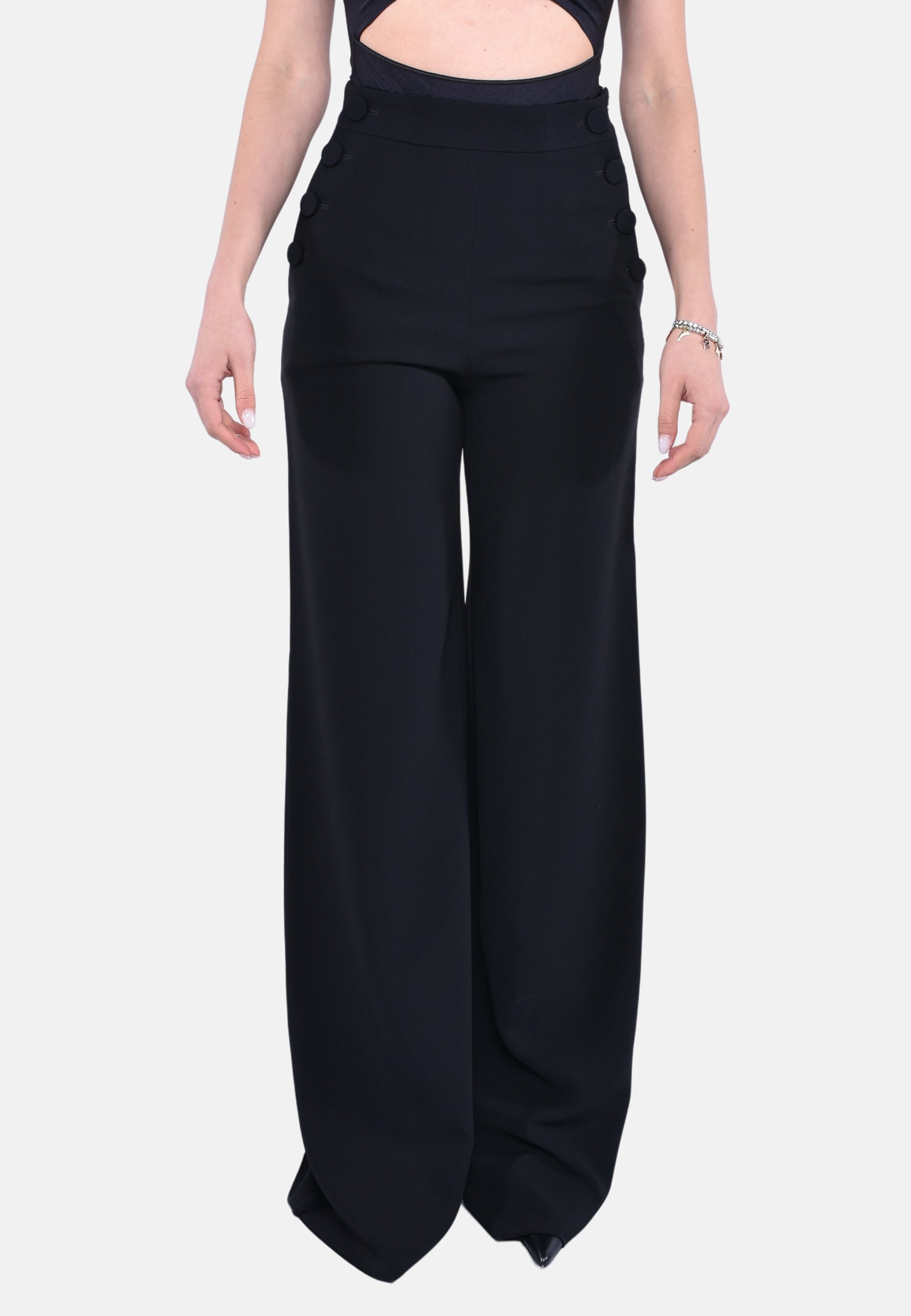 Pantalone in cady, caratterizzato da una silhouette con gamba leggermente ampia e bottoni stile marinière in vita e sui fianchi, ricoperti in tono. Rifinito con piccole pinces in vita sul retro e tasche alla francese. Chiusura con lampo sul fianco sinistro indossato.