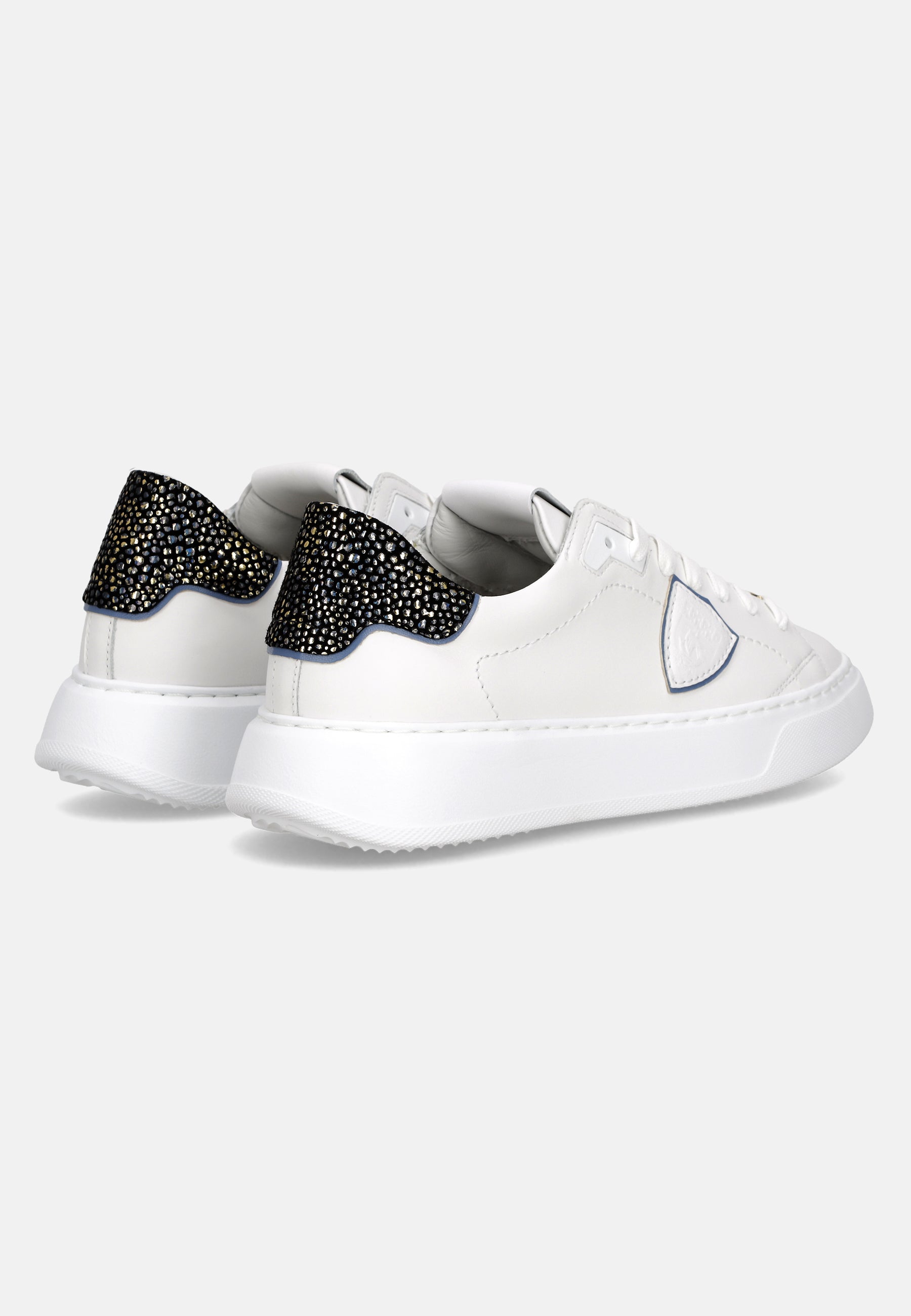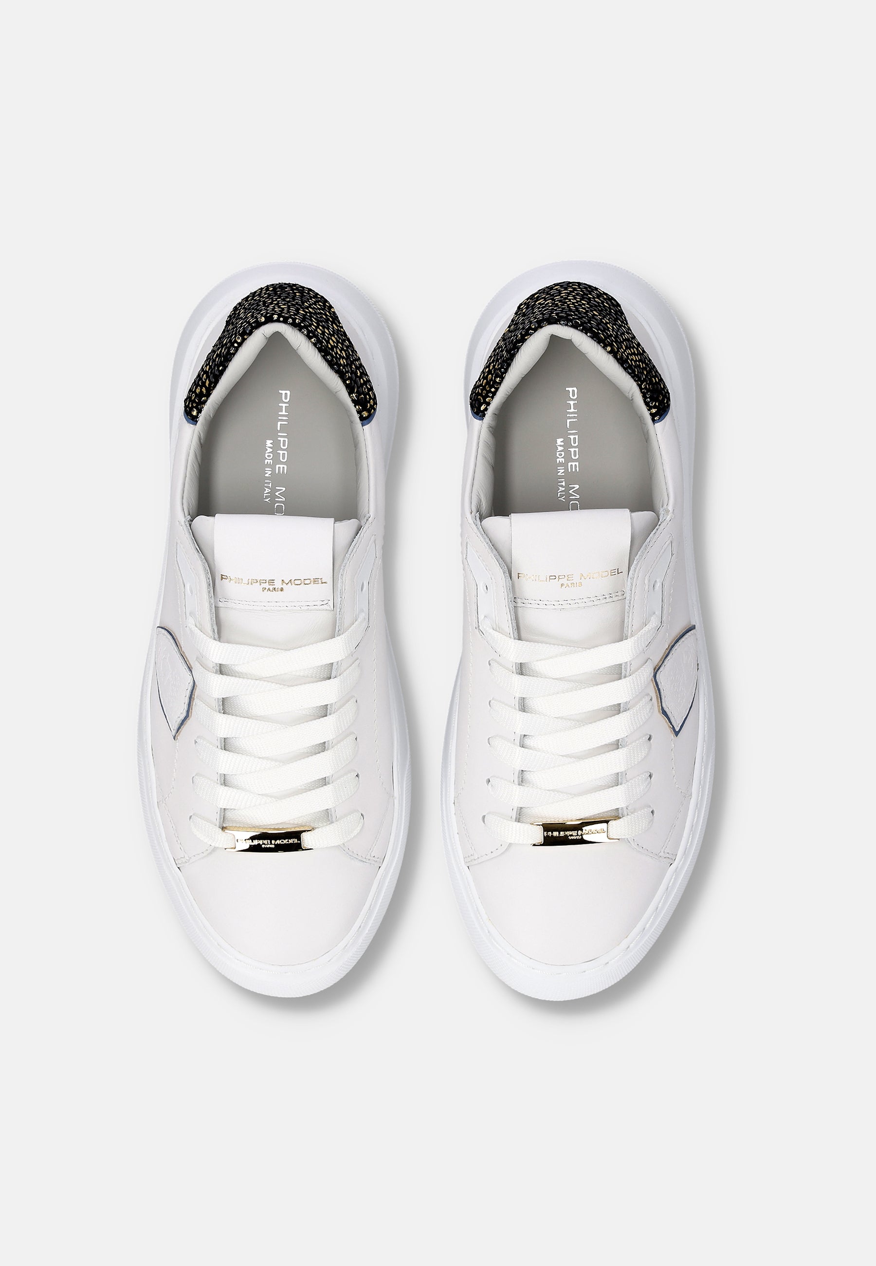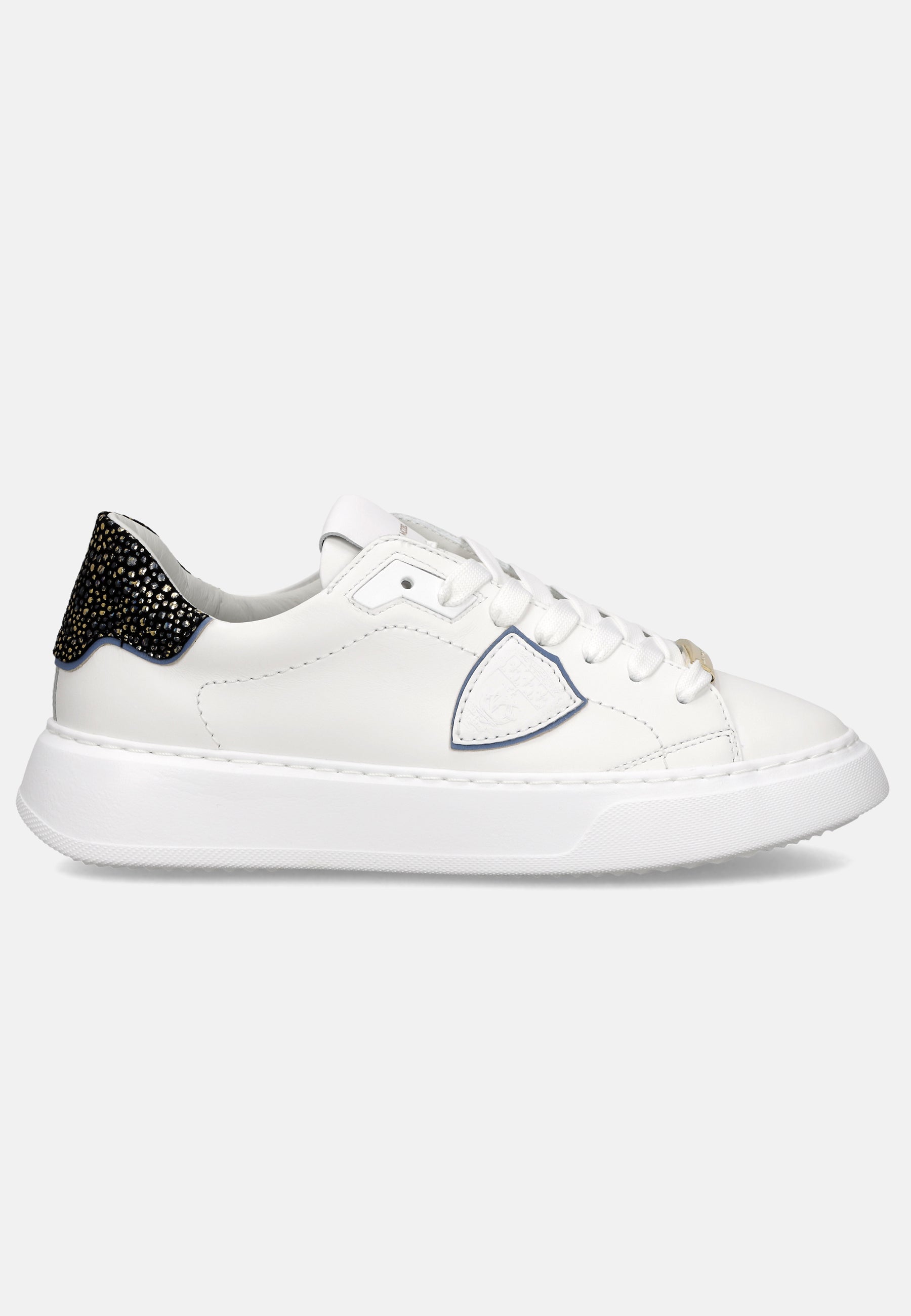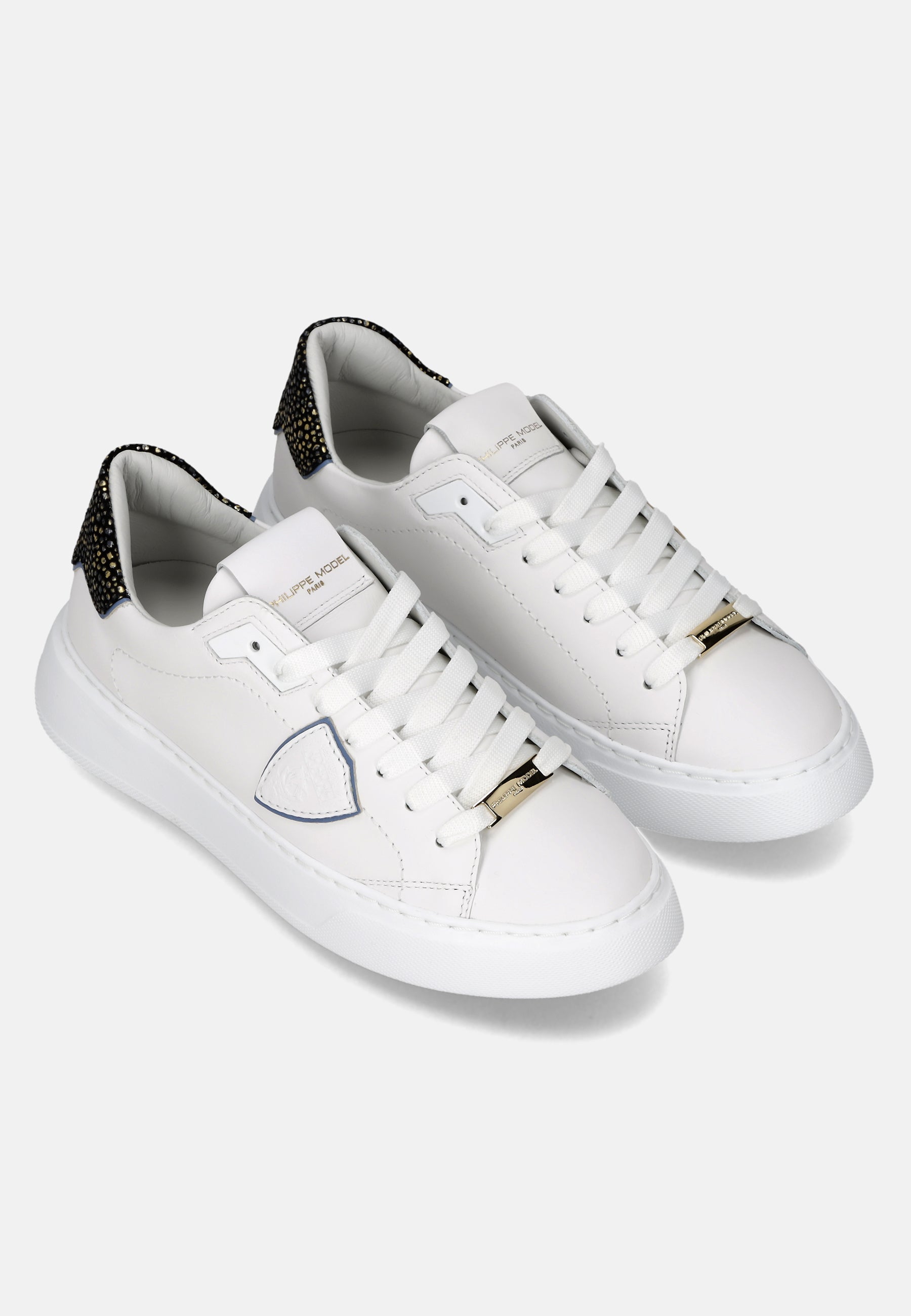 Eleva il tuo stile con le nuove sneaker Temple: forme essenziali ispirate ai modelli nineties rivisitate con creatività e materiali italiani. La tomaia in morbido vitello è completata da spoiler in pelle con stampa leo bianco e oro. Dettagli oro anche nei lacci e nel profilo dello scudo. La suola è in gomma ultra leggera, per un look bold assolutamente contemporaneo.