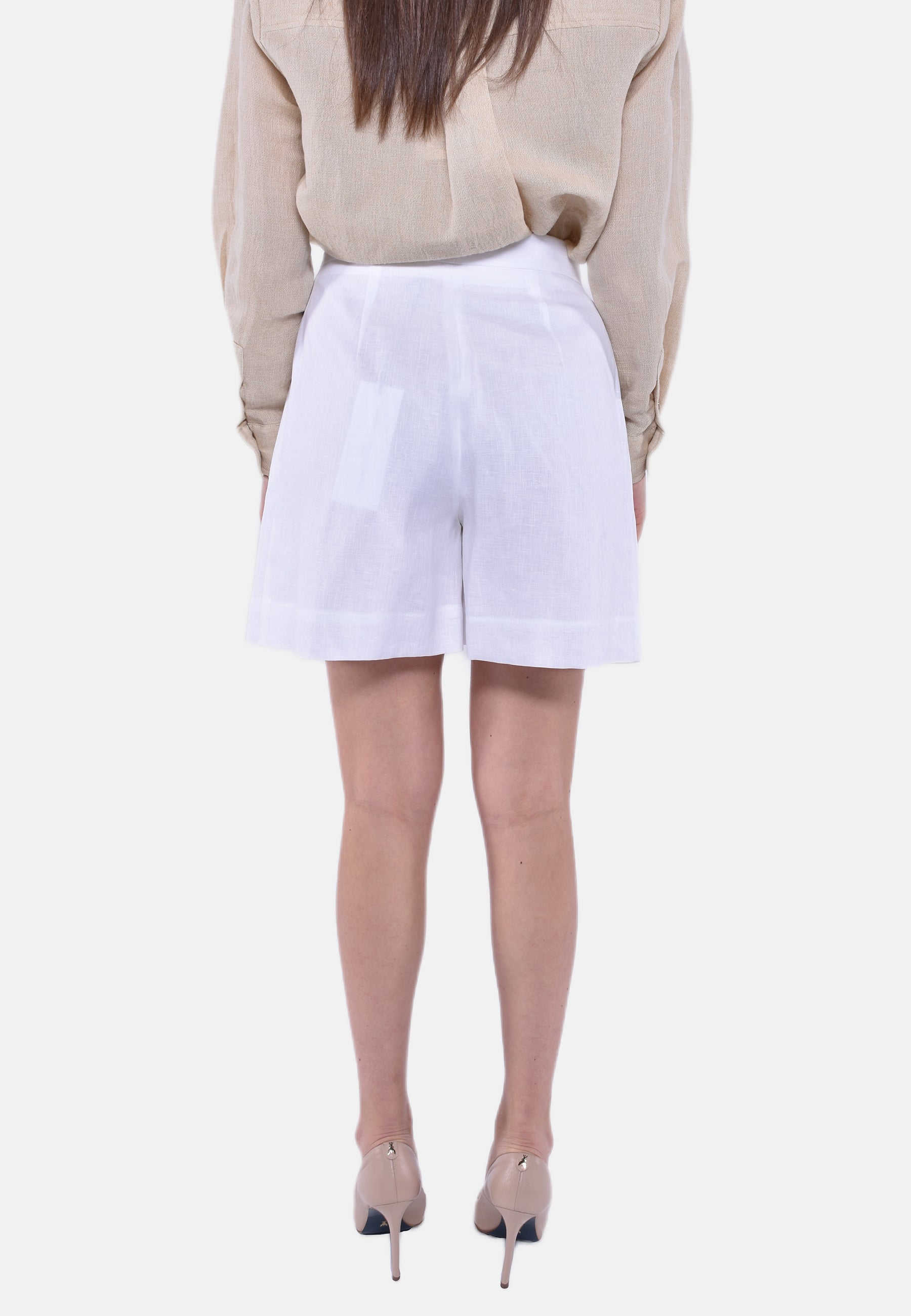 Shorts in lino a vita alta e tasche a filo. Chiusura frontale con cerniera, bottone interno e gancetto metallico. Modello svasato con pinces avanti.