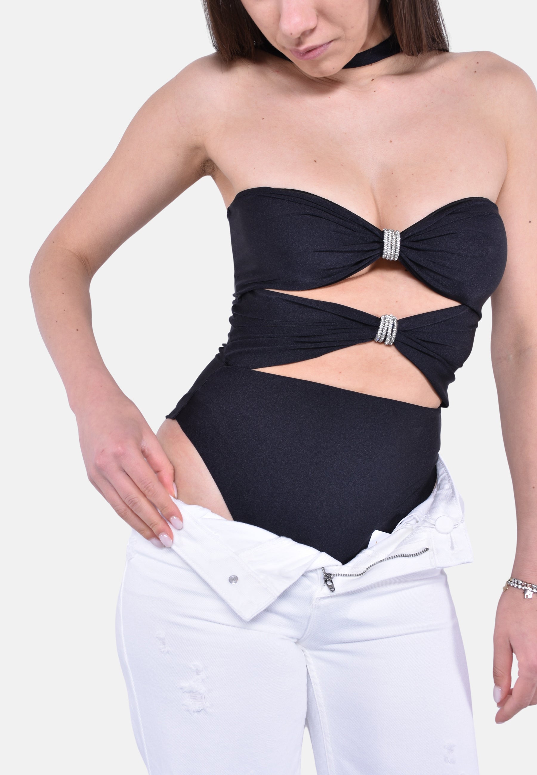 Body in lycra con scollo a cuore e lupetto, cut-out in vita impreziositi da filo in cristallo. Chiusura con bottoncini automatici nella parte inferiore.
