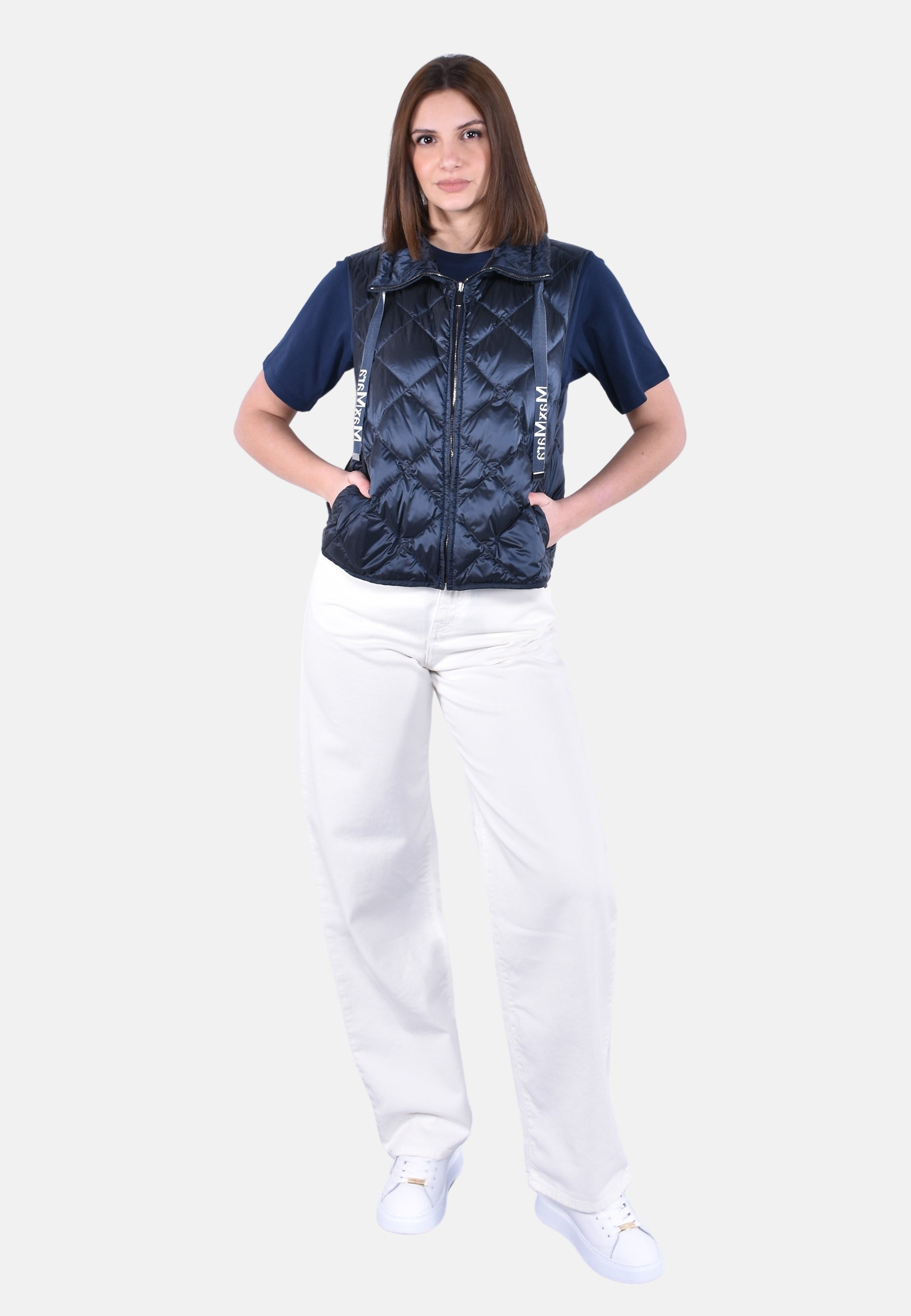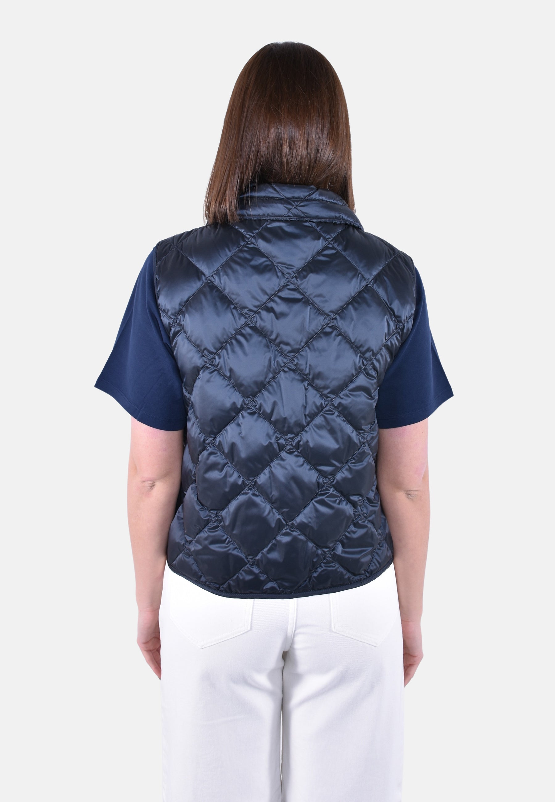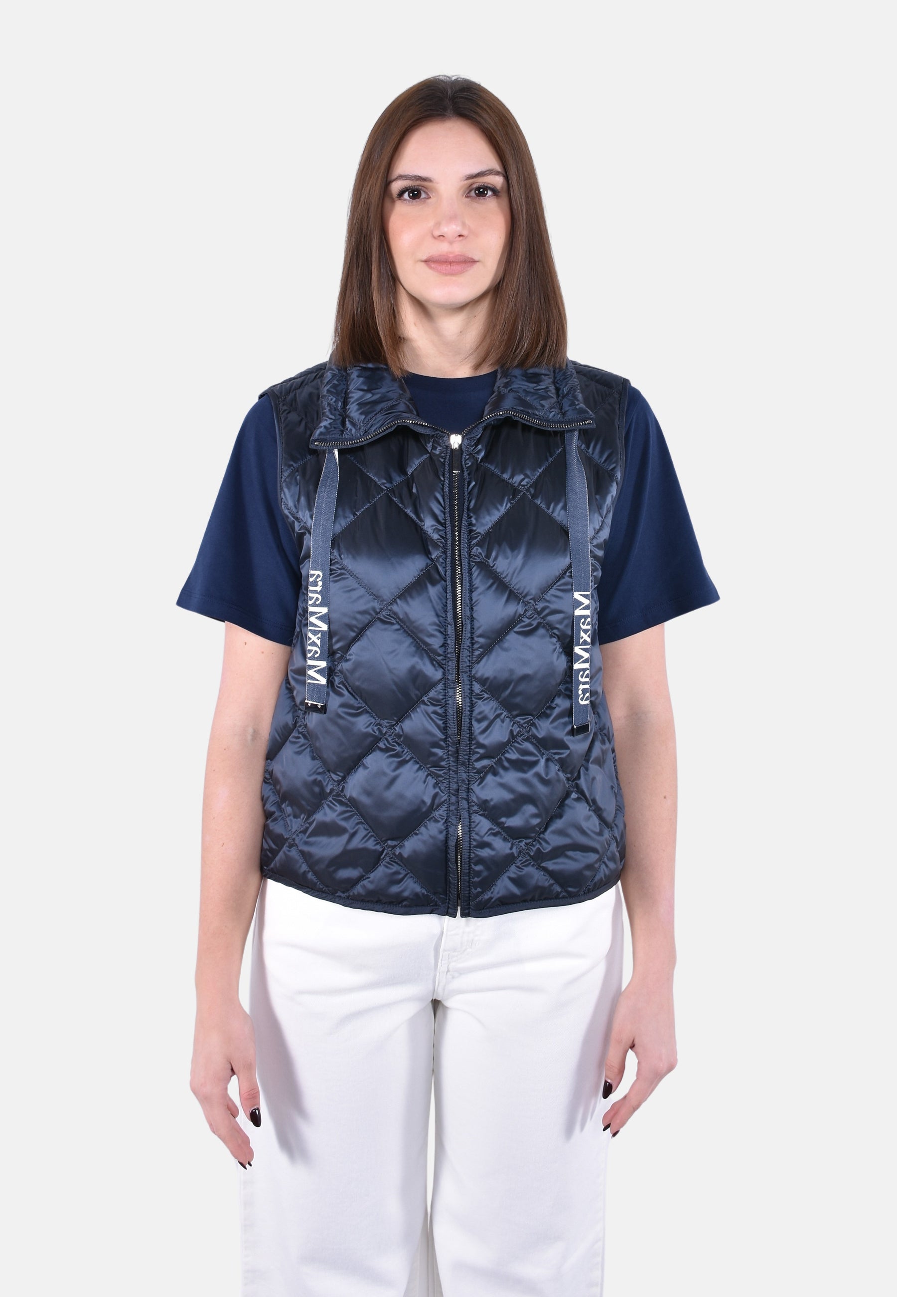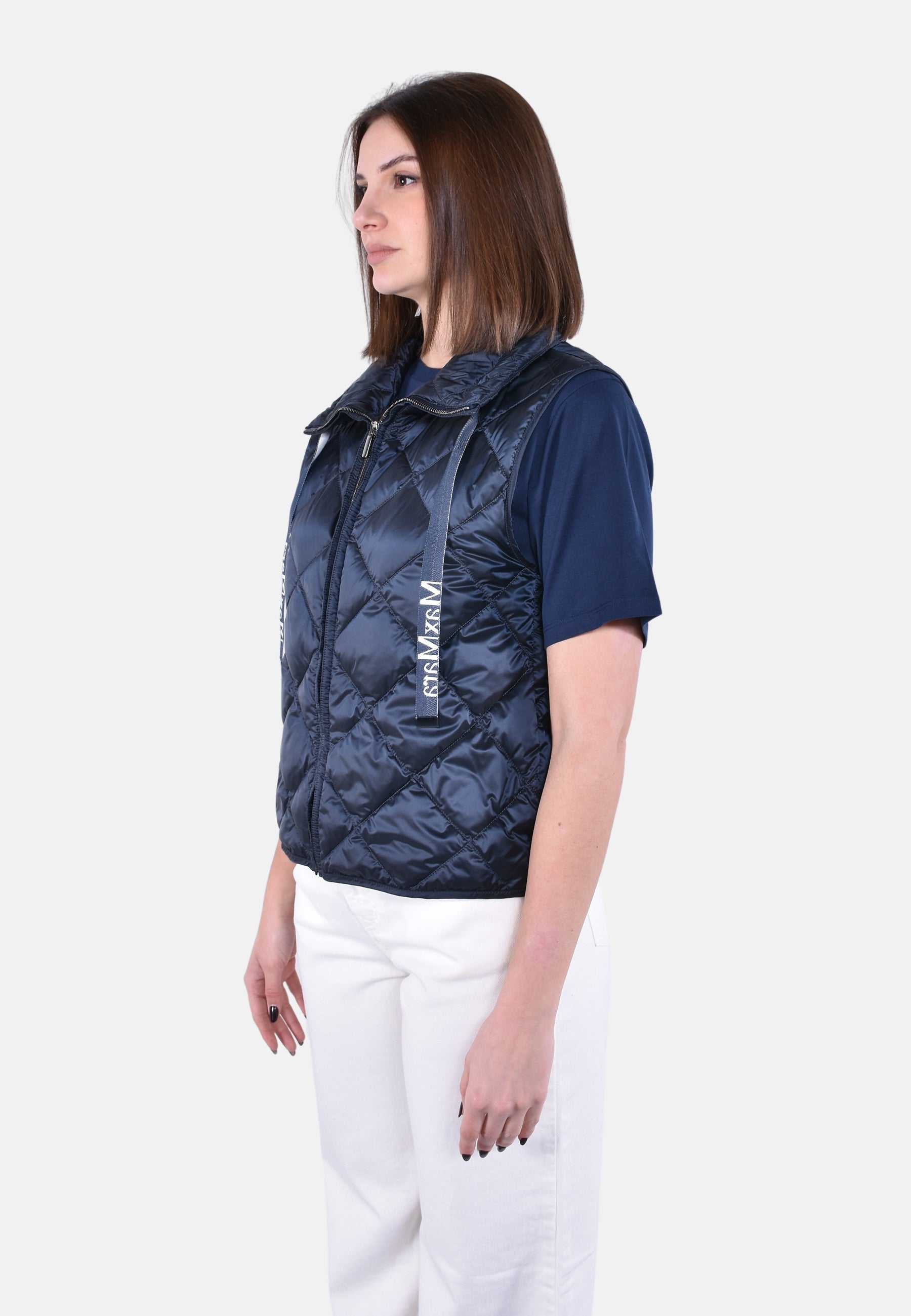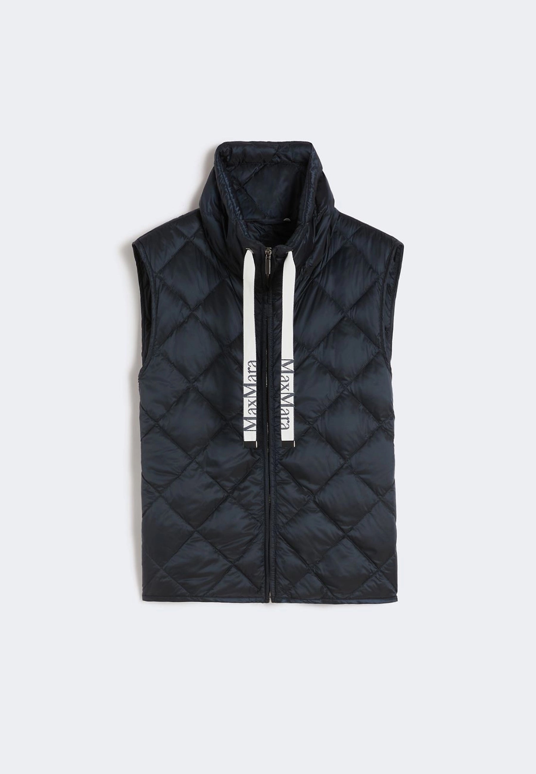 Gilet trapuntato a rombi, caratterizzato da collo alto a coulisse con nastri logati jacquard.