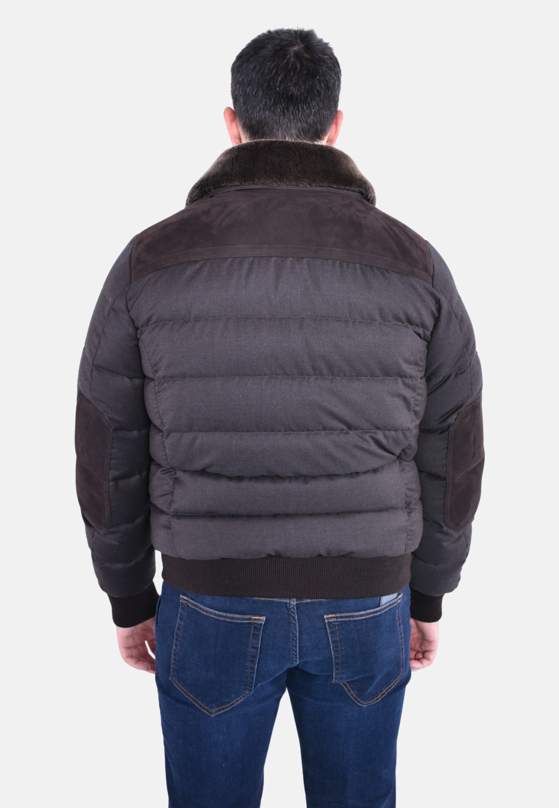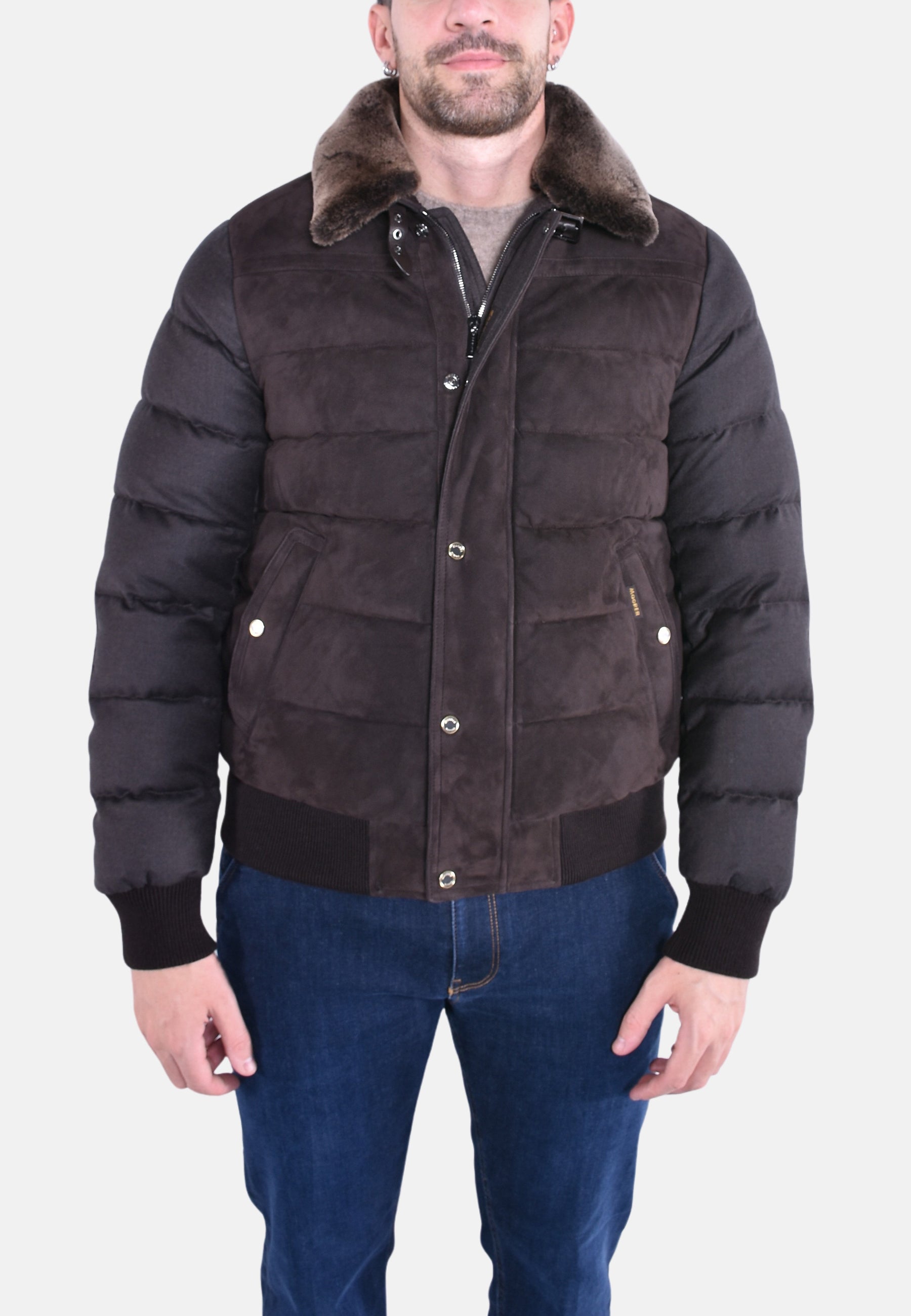 Bomber ibrido trapuntato a boudin imbottito in piuma d'oca, realizzato in misto pelle scamosciata e lana. Doppia chiusura frontale con bottoni a pressione a vista e laccetto in pelle con fibbia sul collo. Fondo e polsi in maglia. Tasche con chiusura da bottoni a pressione a vista. Tasche interne porta documenti con rifiniture con fettucce logate.