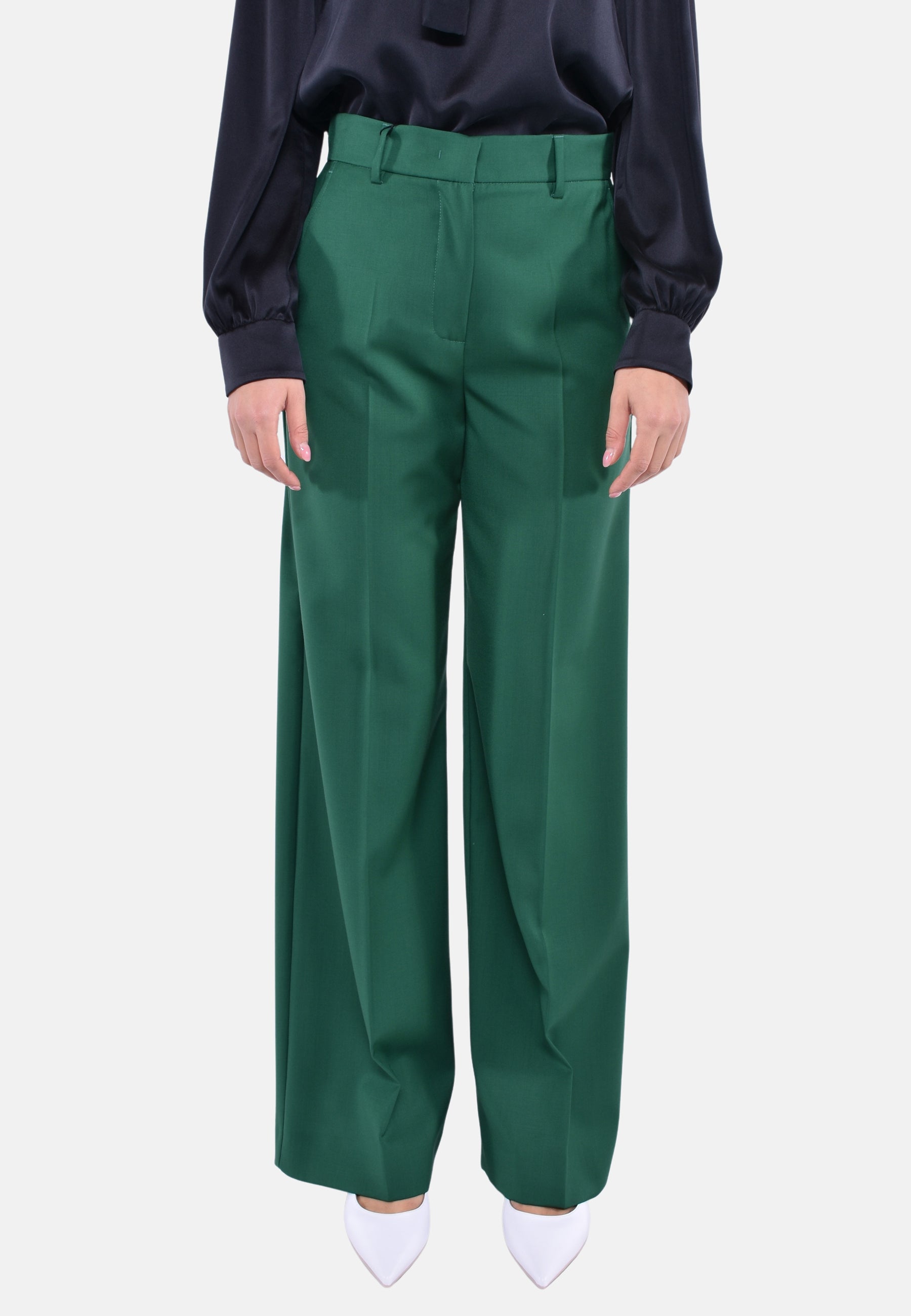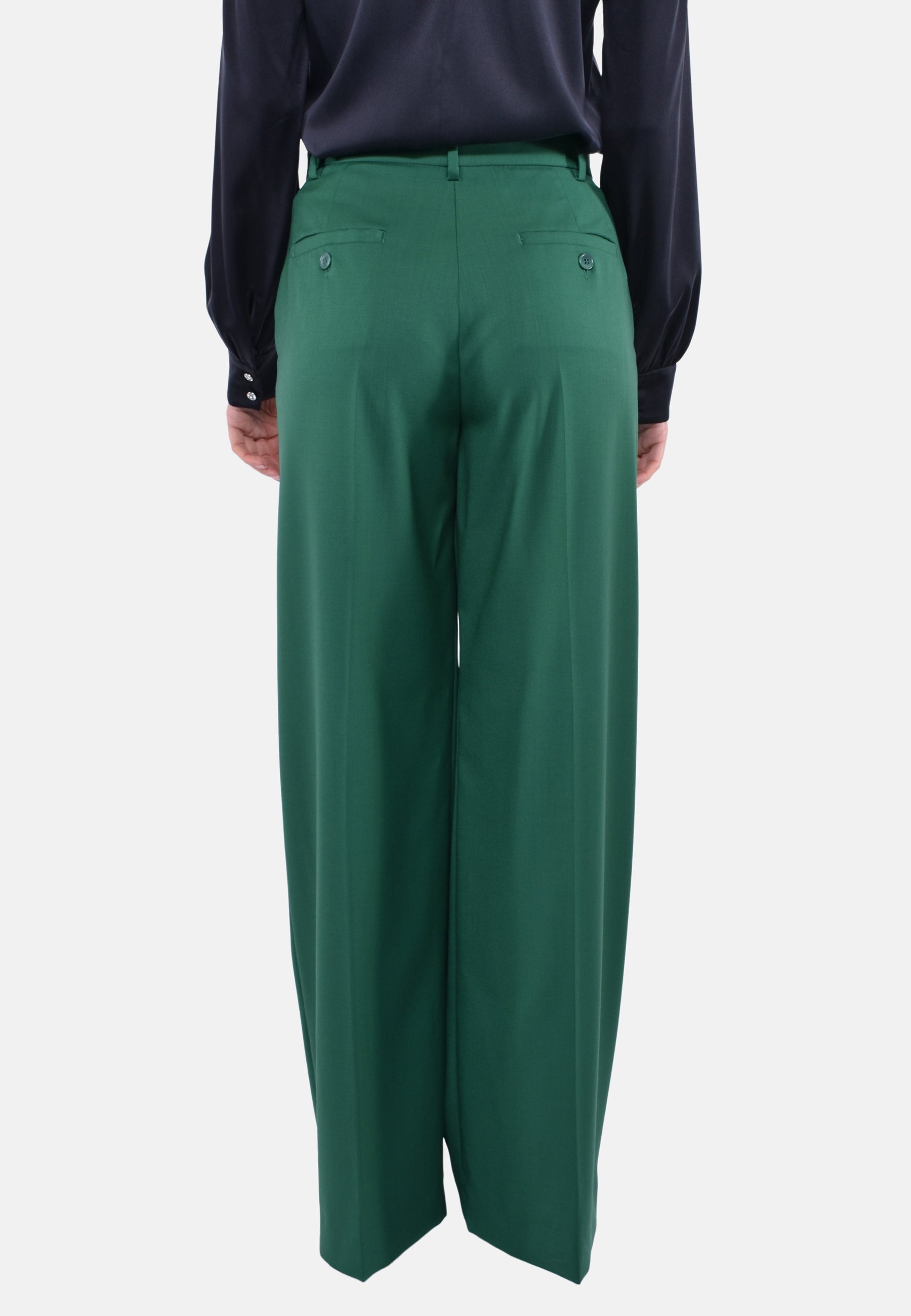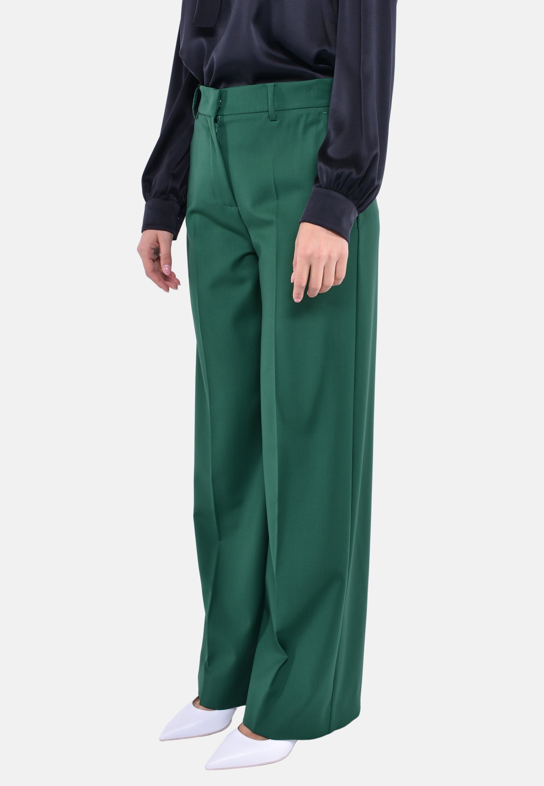 Pantalone a palazzo realizzato in pregiata e leggera tela di pura lana stretch, caratterizzato da una silhouette con gamba larga e piega stirata. Il modello è completato da tasche alla francese sui fianchi e tasche a filetto con bottone sul retro. Chiusura con listino alto in vita, zip con patta e gancetto.