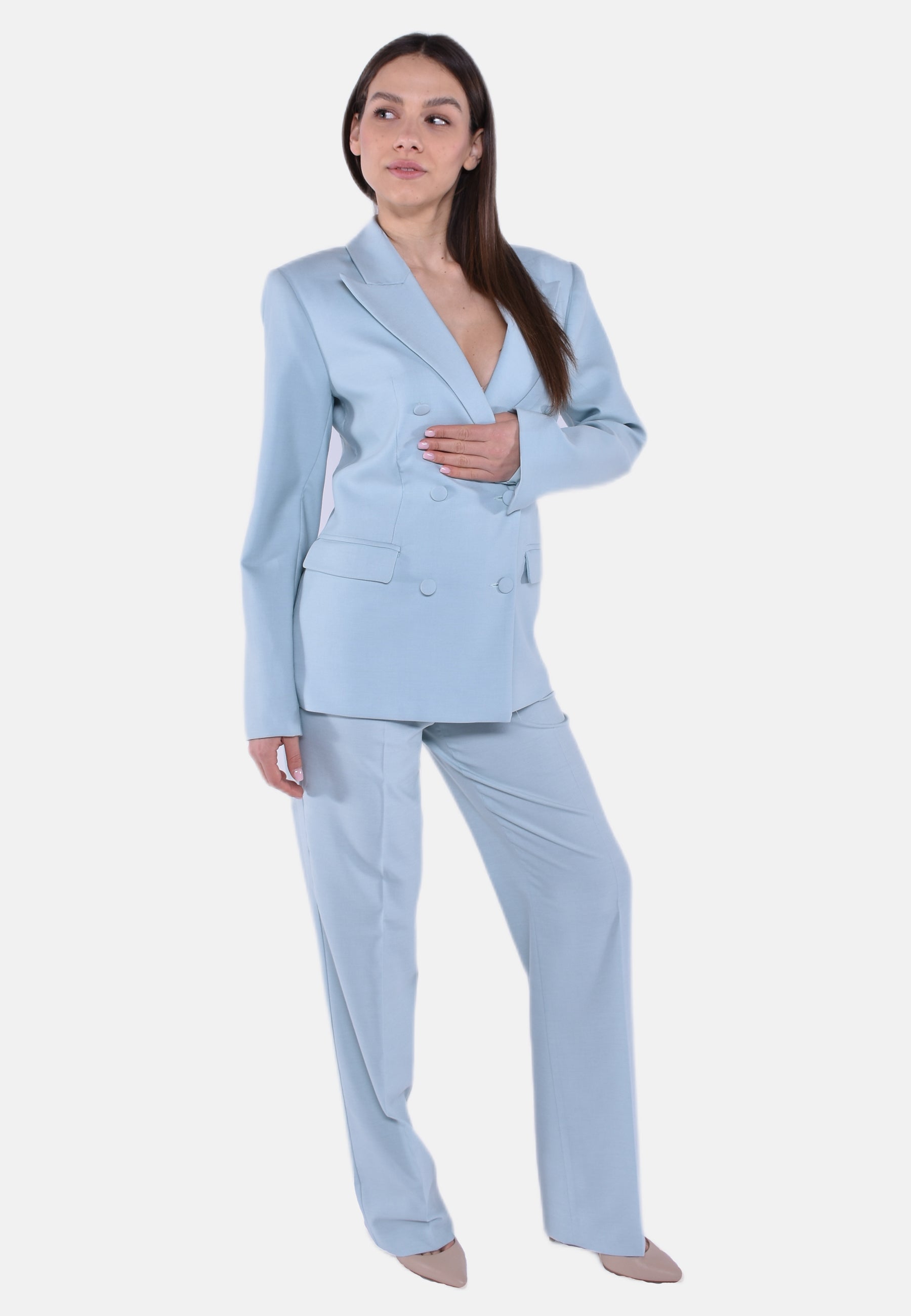 Giacca avvitata doppiopetto a sei bottoni rivestiti dello stesso tessuto. Spalline e rever a lancia. Tasche a filo con pattina.