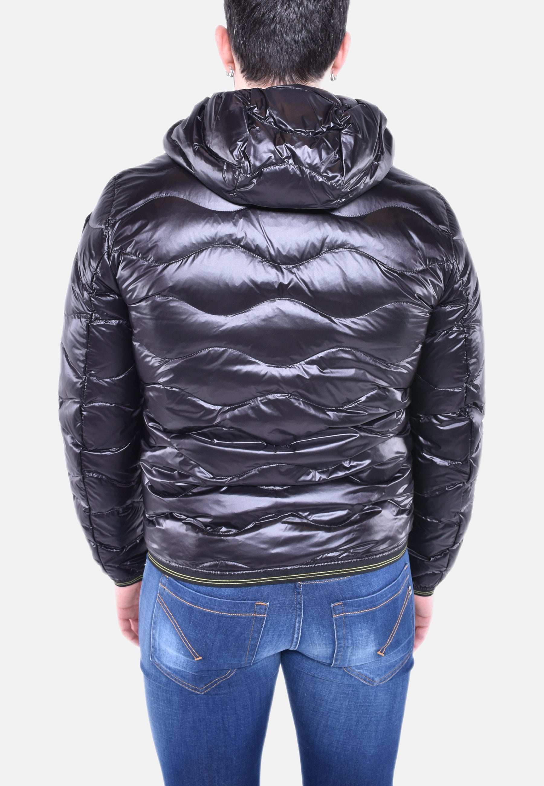 Piumino in nylon lucido con cappuccio fisso impunturato a onde orizzontali e tasca applicata sul petto a sinistra con zip verticale.
