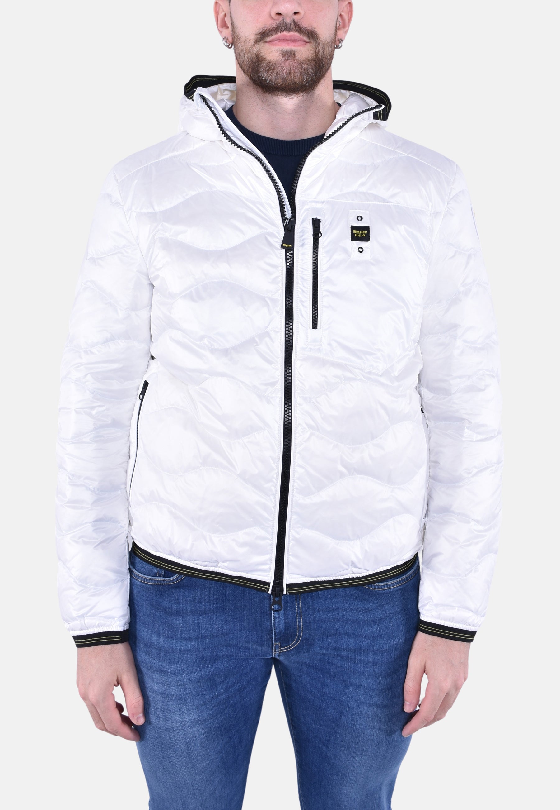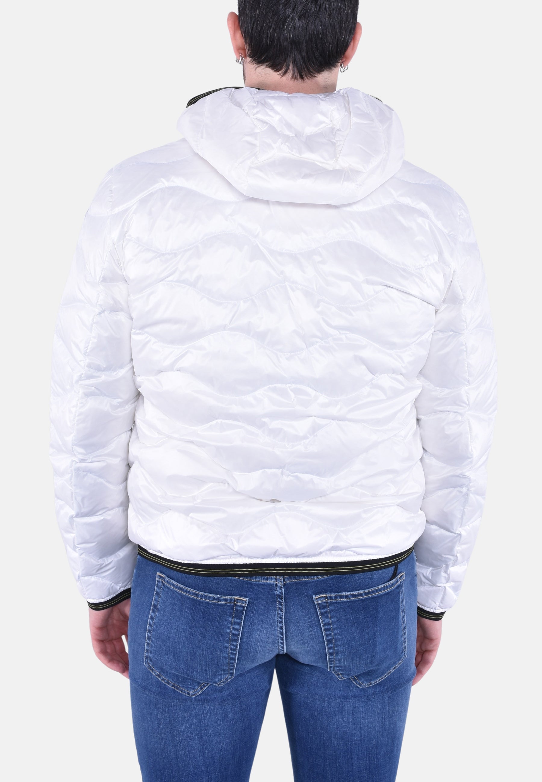 Piumino in nylon lucido con cappuccio fisso impunturato a onde orizzontali e tasca applicata sul petto a sinistra con zip verticale.