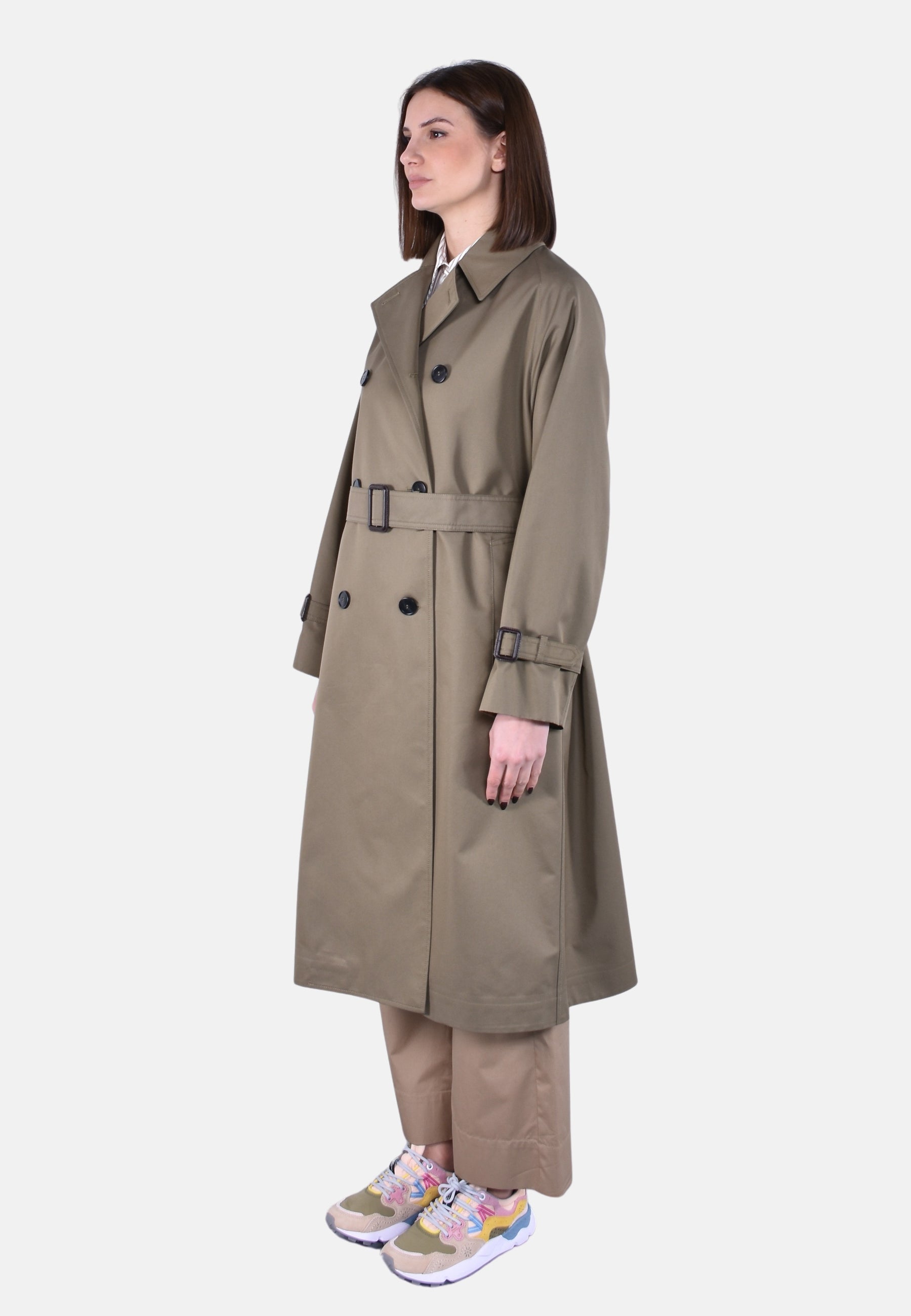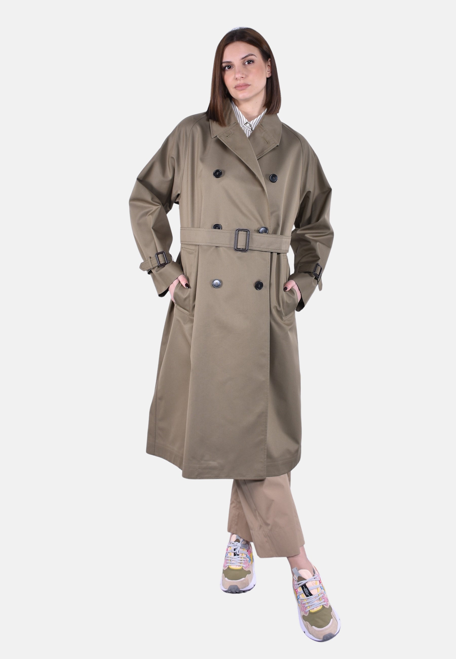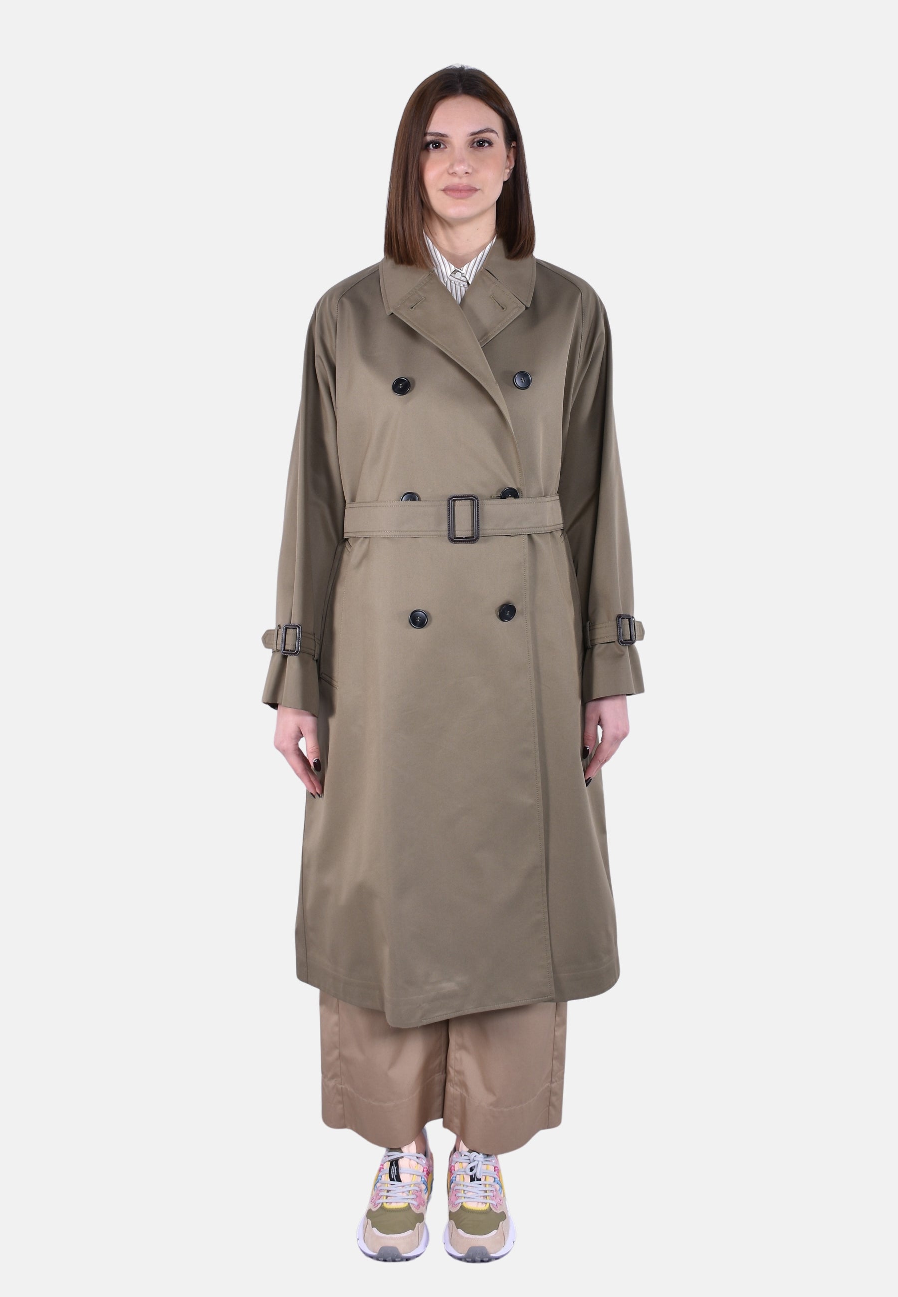 Chiusura con bottoni e cintura abbinata con fibbia in pelle