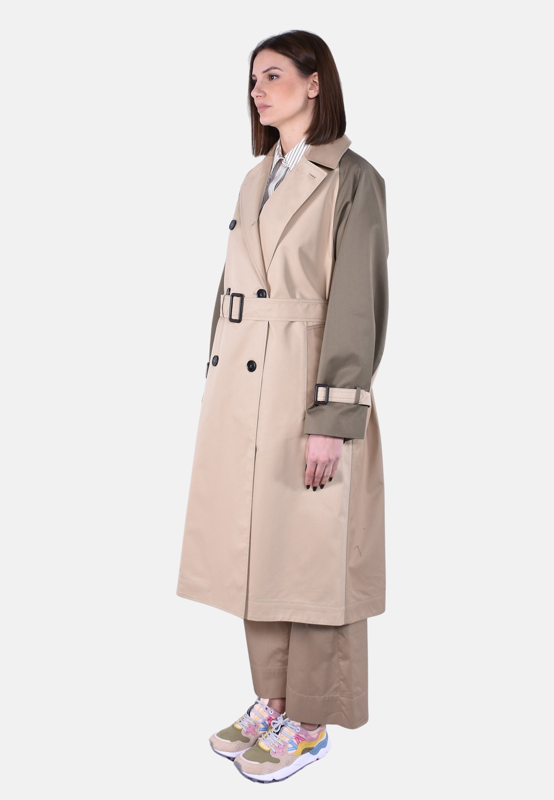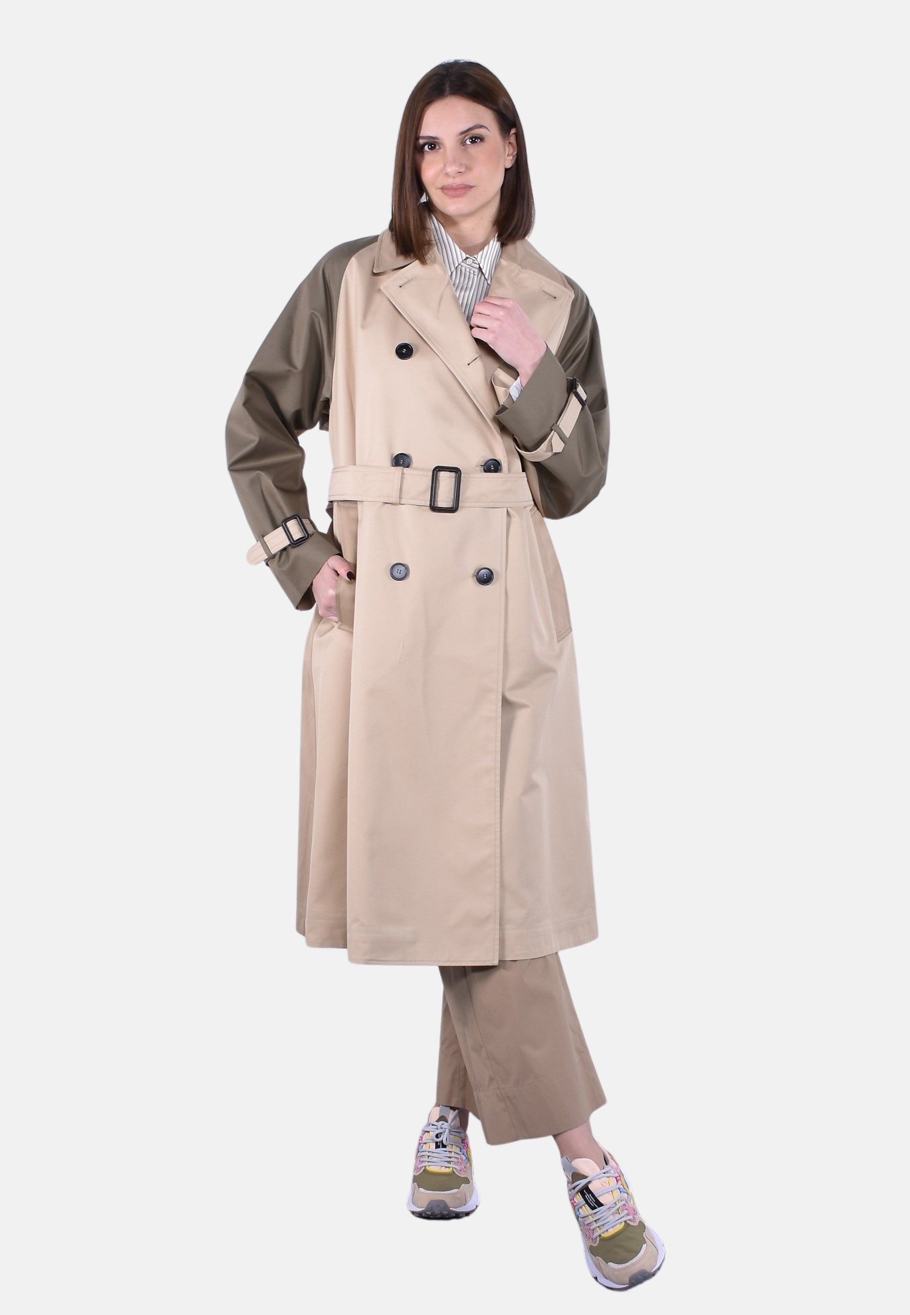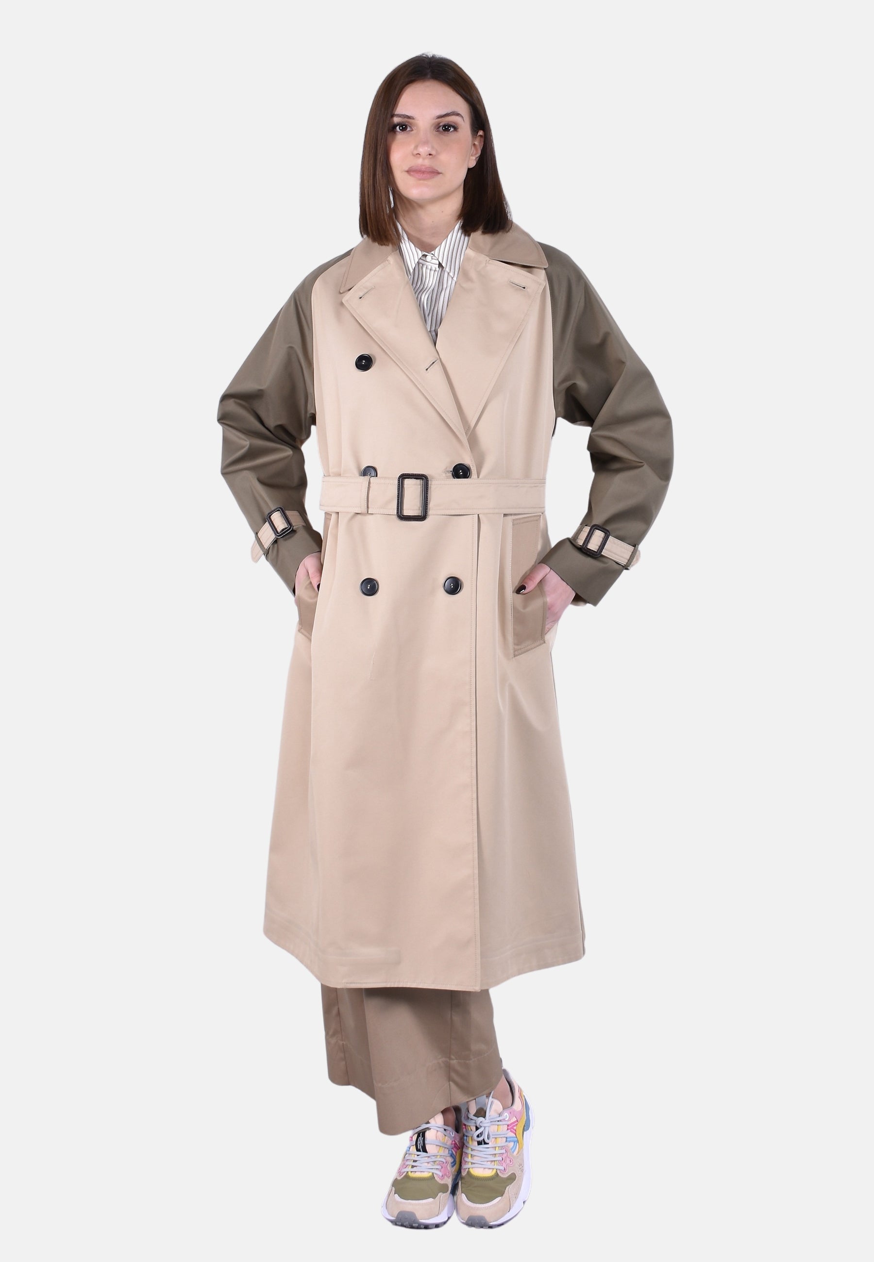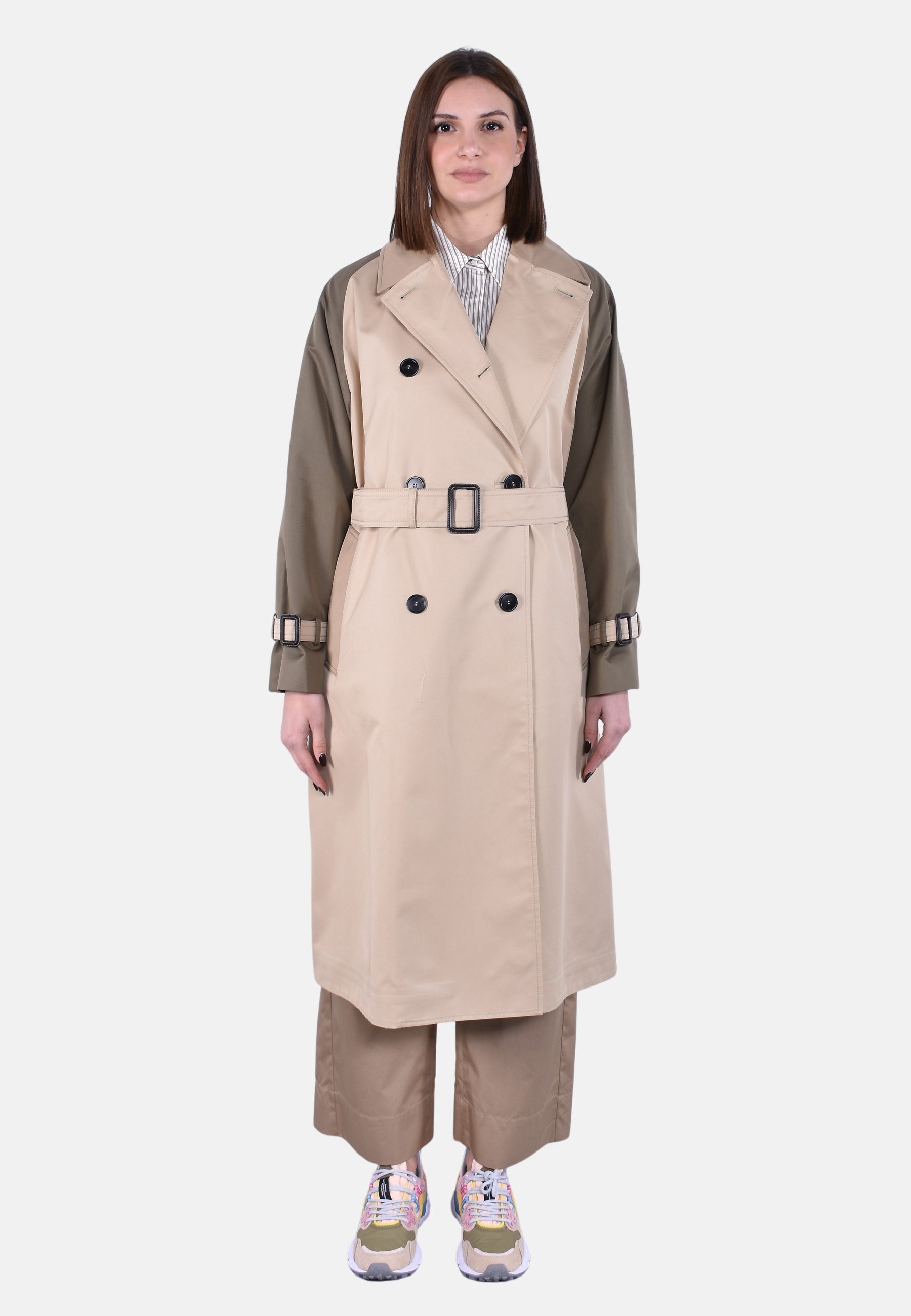 Chiusura con bottoni e cintura abbinata con fibbia in pelle