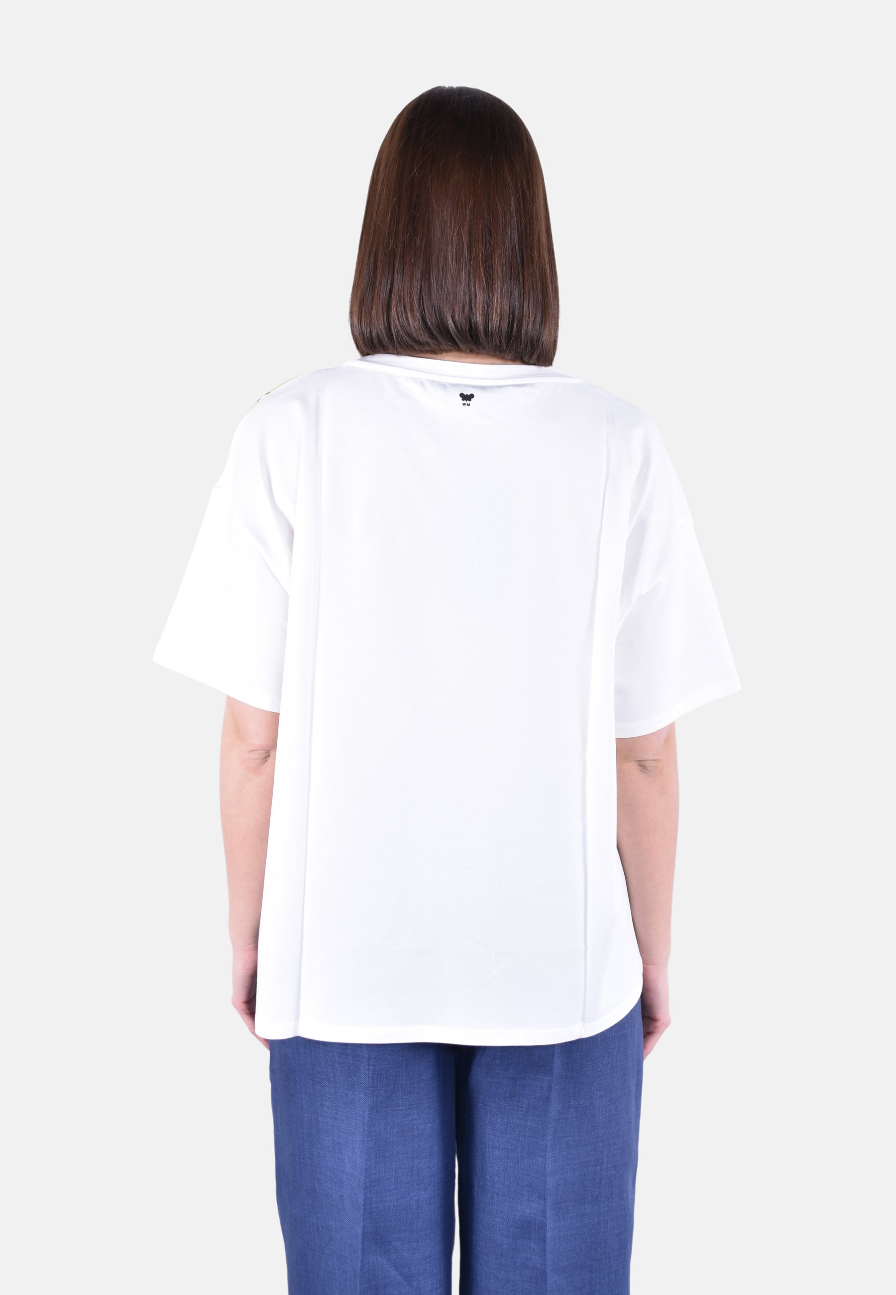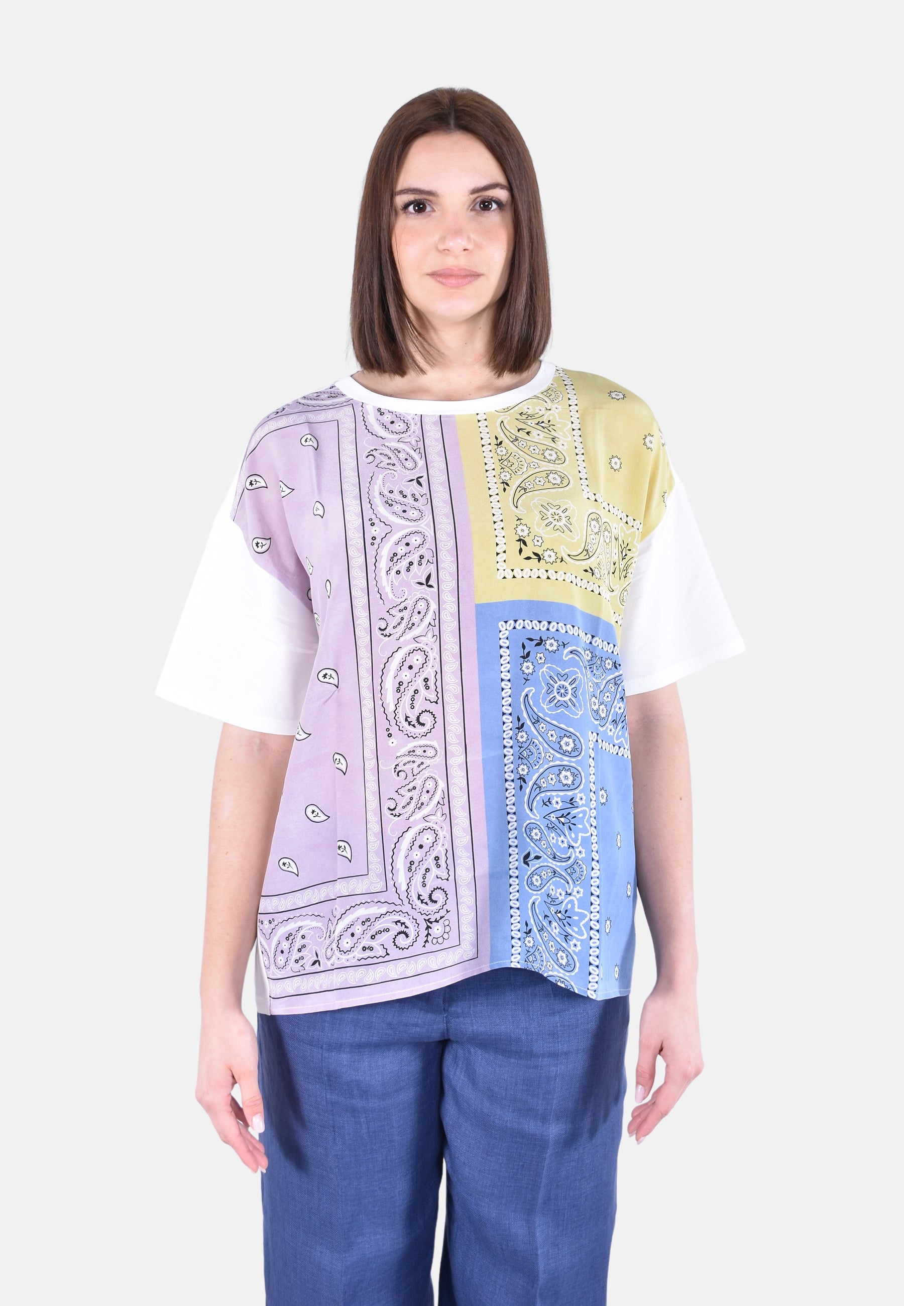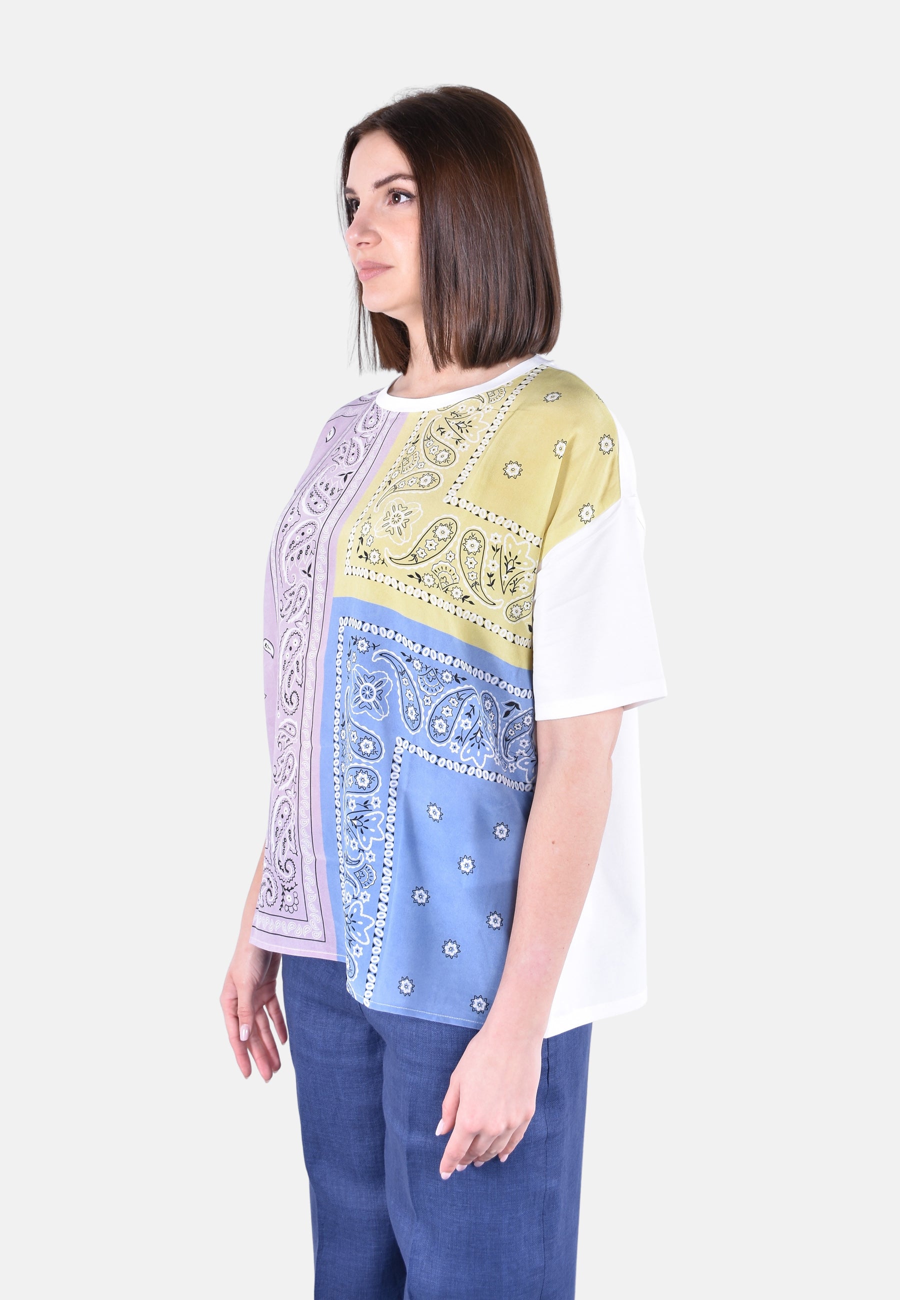 T-shirt girocollo, caratterizzata da inserto frontale in crêpe de Chine di pura seta stampata.