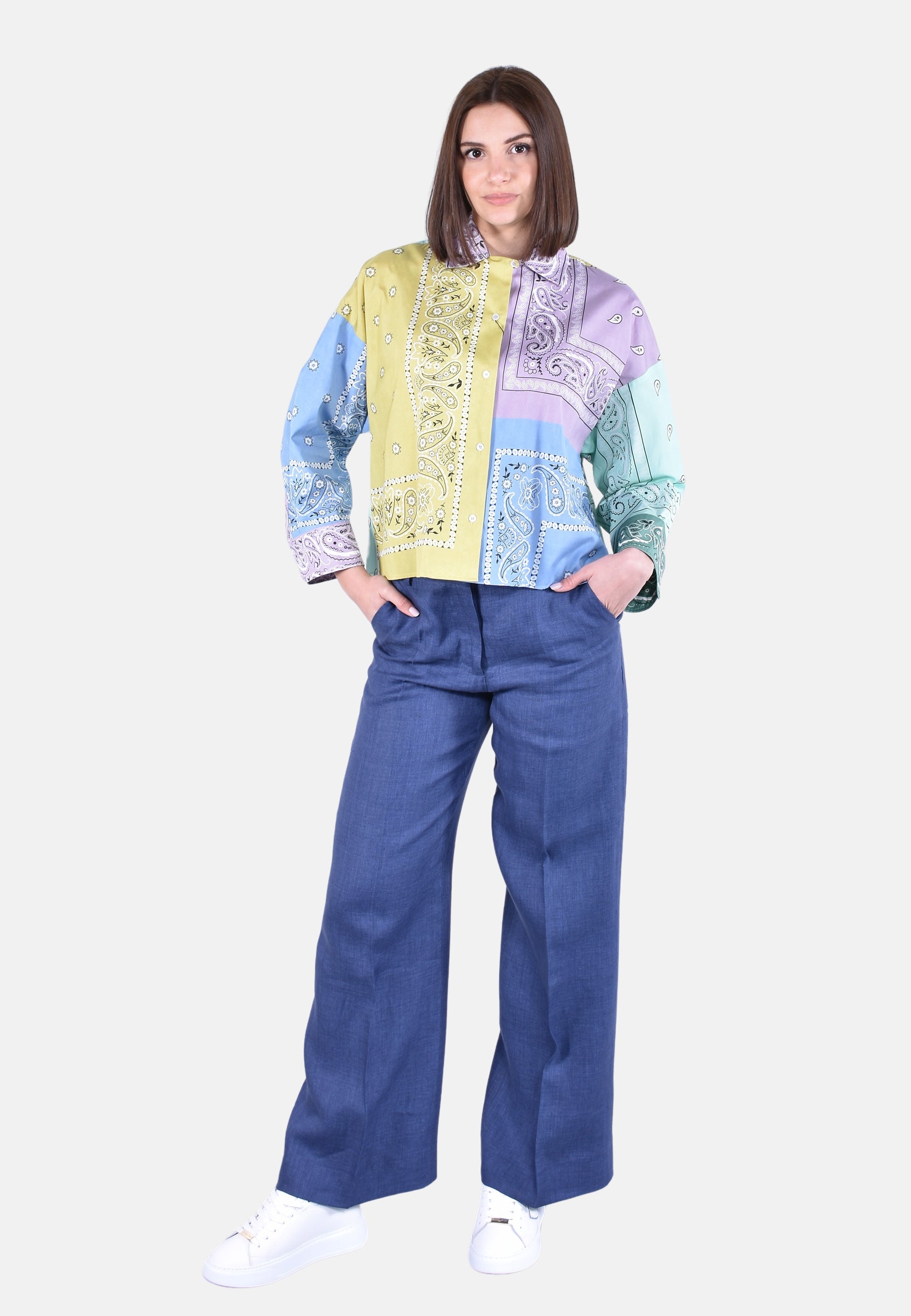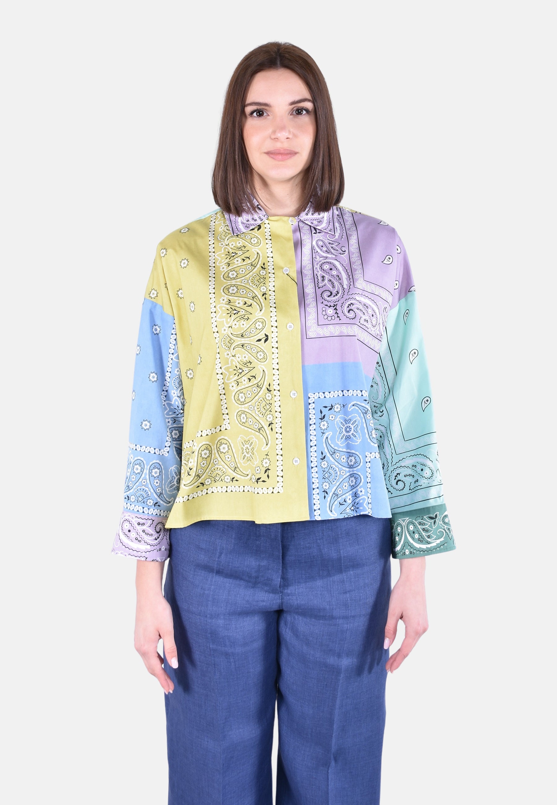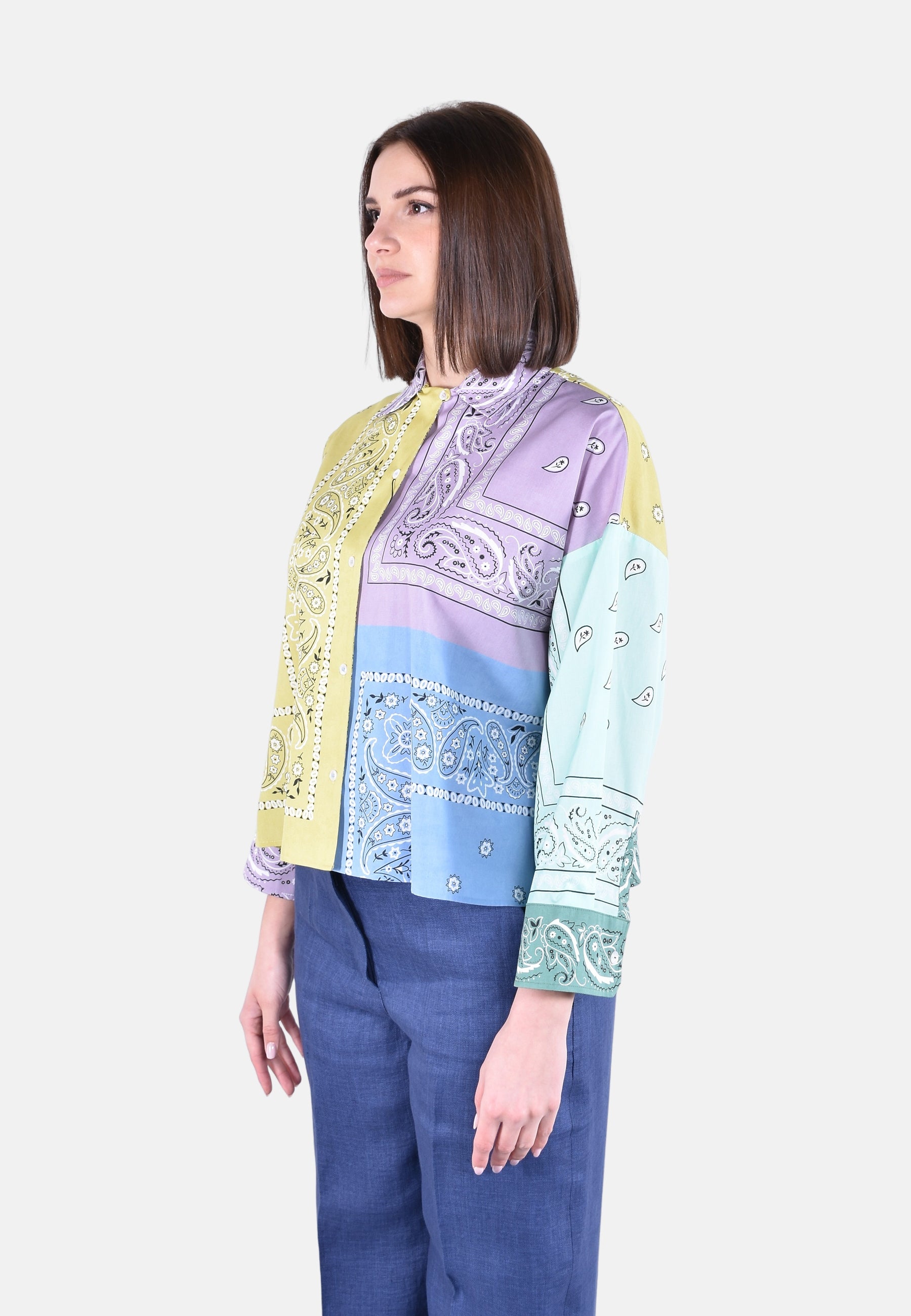T-shirt girocollo, caratterizzata da inserto frontale in crêpe de Chine di pura seta stampata.